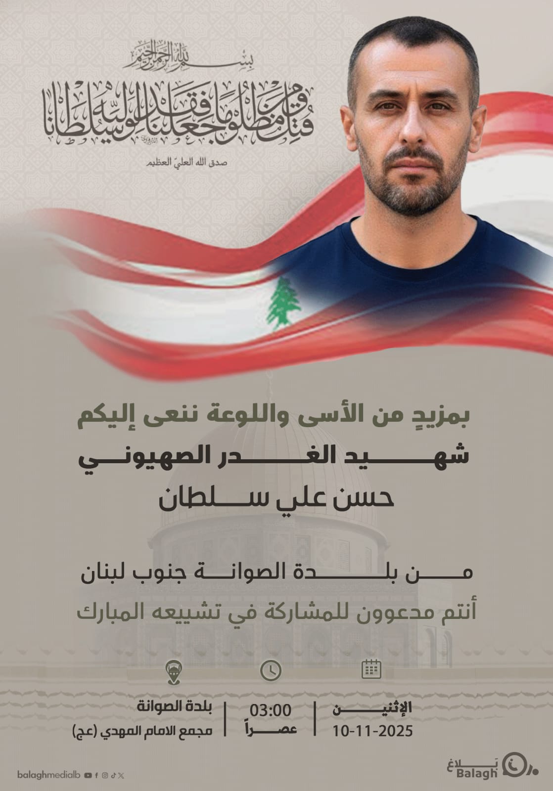 وفي وقت لاحق، أعلنت وزارة الصحة العامة عن استشهاد المواطن حسن علي سلطان من بلدة الصوانة، جراء غارة نفّذتها مسيرة إسرائيلية على الطريق العام في البلدة.