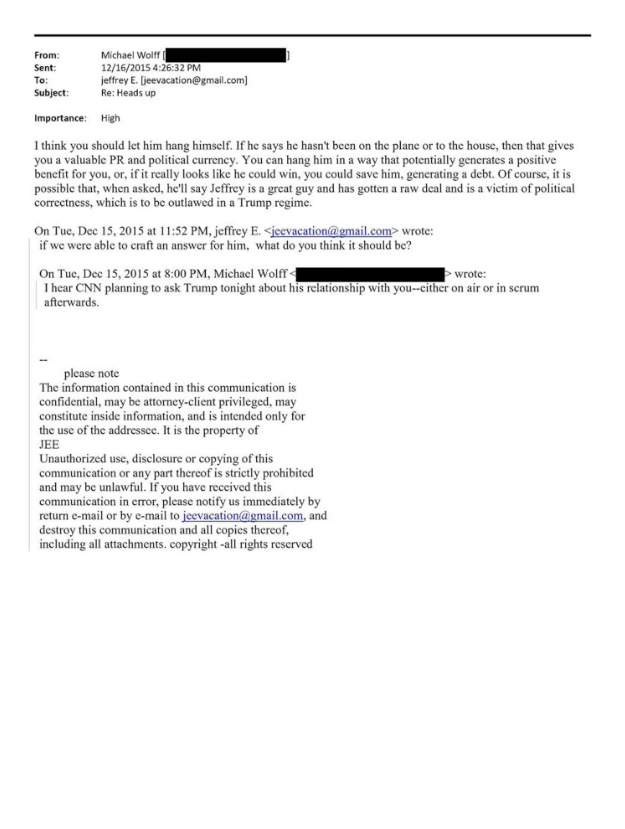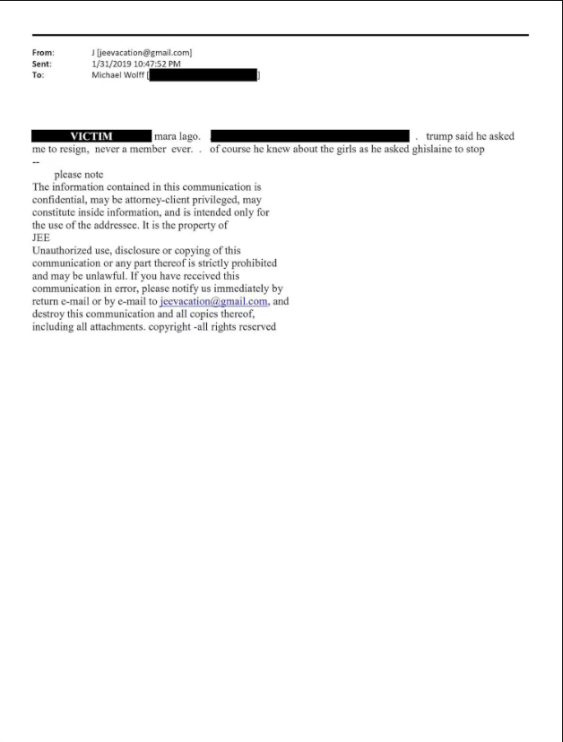 وفي رسالة مؤرخة في 2 نيسان 2011، كتب إبستين إلى ماكسويل قائلاً: “أريدك أن تدركي أن الكلب الذي لم ينبح هو ترامب... [محتوى محجوب] قضى/ت ساعات في منزلي معه، ولم يُذكر ولو لمرة واحدة... أنا وصلت إلى نسبة 75%”.