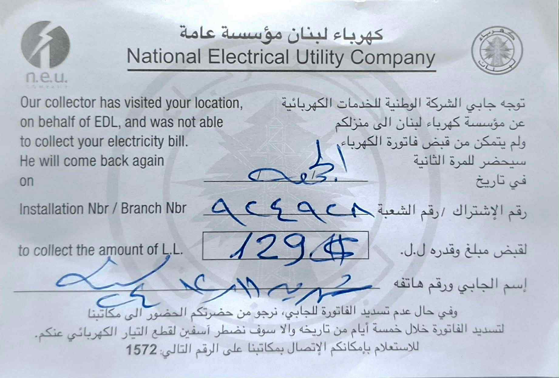 وأشار بزي إلى أنّه سبق ودفع فاتورة شهري أيلول وتشرين الأول بقيمة 80 دولارًا، معتقدًا أنّ الاستهلاك يعود لأسابيع ما قبل الحرب، قبل أن يكتشف أنّ الفواتير تُصدر بلا منطق، بلا قياس، وبلا عدّادات فعلية.