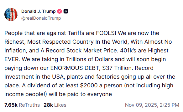 ويكرّر ترامب التأكيد على أنّ الاقتصاد الأميركي "في حالة ممتازة"، مرجعاً جزءاً من تحسّن الأسعار إلى سياسة الرسوم الجمركية التي اعتمدها منذ عودته إلى البيت الأبيض.
