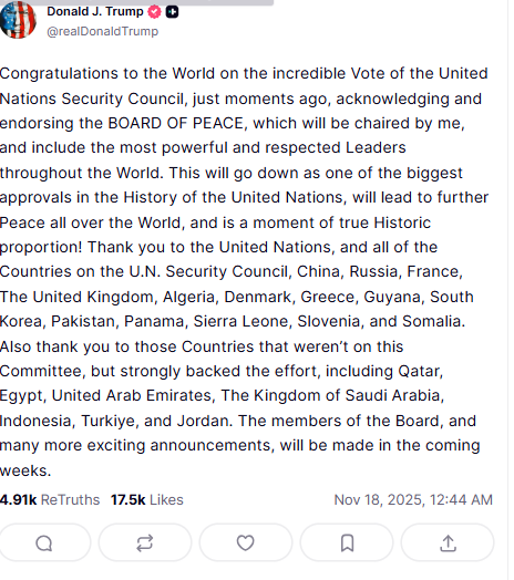 وعبّر ترامب عن شكره للدول التي صوتت على القرار في مجلس الأمن، مشيرًا إلى أنه "سيتم الإعلان عن أعضاء المجلس (مجلس السلام الذي سيرأسه)، إضافة إلى العديد من الإعلانات المثيرة الأخرى في الأسابيع المقبلة".