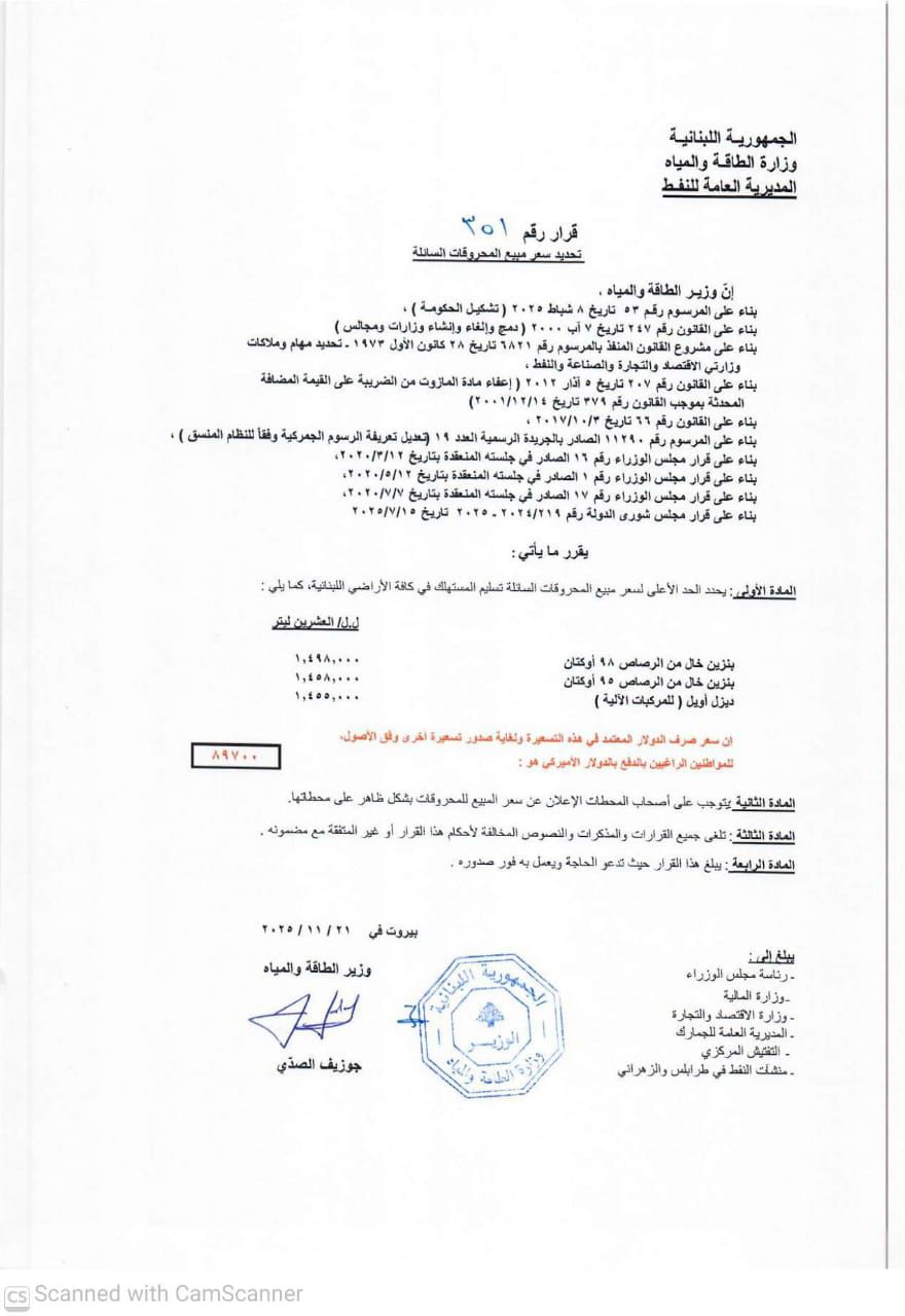 صدر عن وزارة الطاقة والمياه صباح اليوم الجمعة, جدولٌ جديد للمحروقات، وجاءت الأسعار على الشّكل التالي: