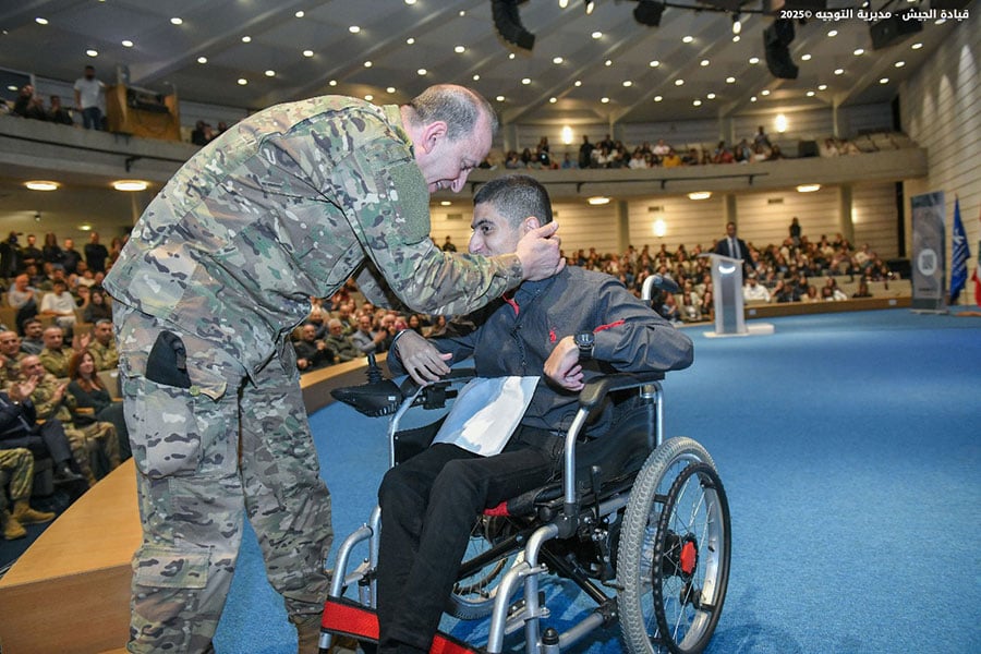 وقال: "الجيش قوي ولا خوف عليه، وهو قادر على الصمود في وجه العواصف، ويضع نصب عينيه الدفاع عن لبنان بكل مكوّناته. والمؤسسة العسكرية تنظر بعين واحدة إلى جميع اللبنانيين، وتؤدي واجبها بشفافية واحتراف رغم التضحيات الكبيرة".