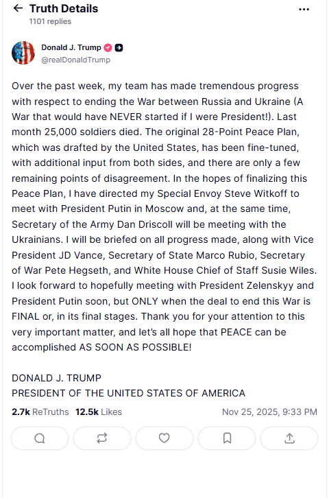 وأوضح ترامب، في منشور على صفحته عبر منصة "تروث سوشال"، أن وزير الجيش دان دريسكول سيتولى هو الآخر إجراء مفاوضات مع الجانب الأوكراني، مشيراً إلى أنه يأمل شخصياً في لقاء الرئيس الأوكراني فولوديمير زيلينسكي والرئيس الروسي، ولكن "فقط عند إبرام اتفاق إنهاء هذه الحرب أو بلوغ المراحل النهائية" من المناقشات.