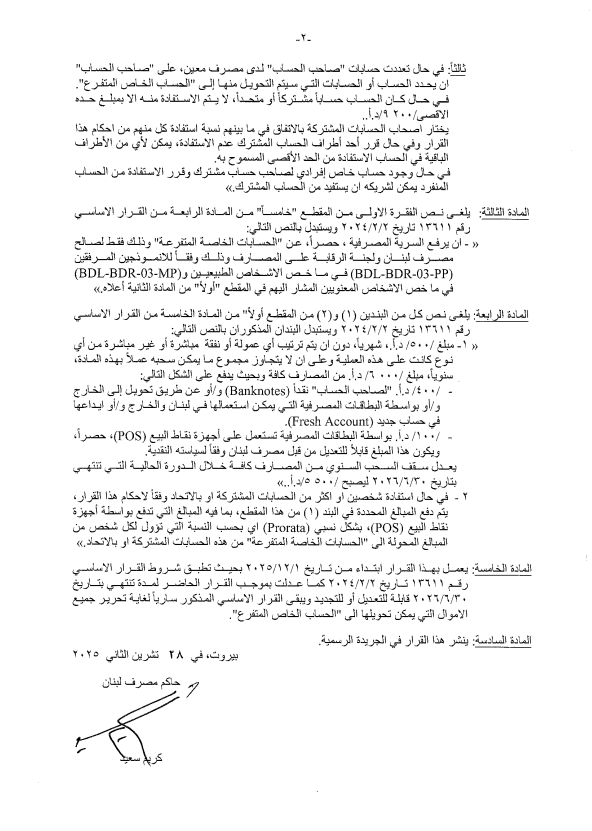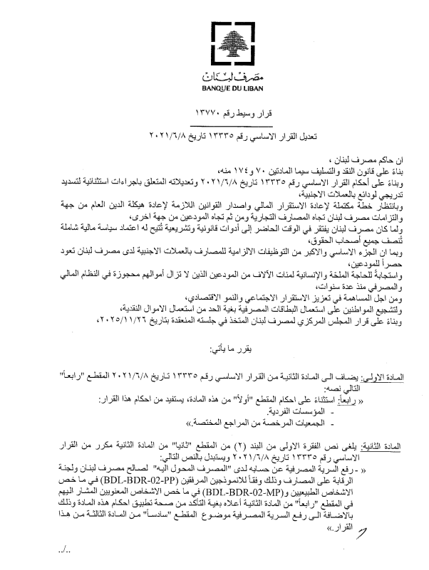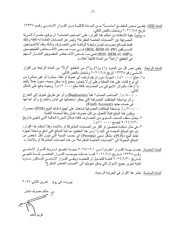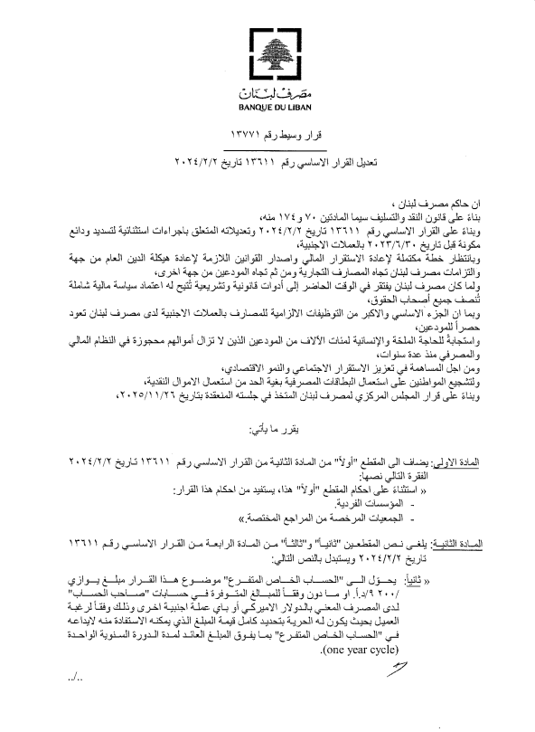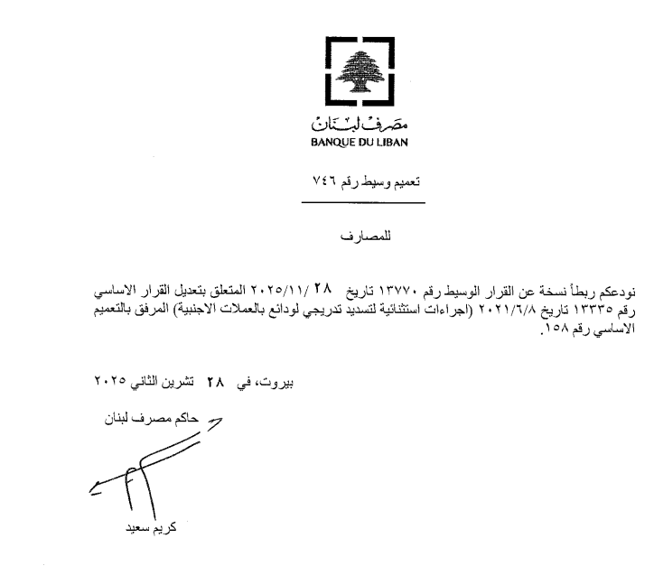 أصدر مصرف لبنان سلسة تعاميم وقرارات وسيطة جديدة موجّهة إلى المصارف، شملت تعديلات أساسية على آليات تسديد الودائع بالعملات الأجنبية، في إطار ما وصفه المصرف بـ"الإجراءات الاستثنائية" الهادفة إلى تنظيم السحوبات وتسهيل العمليات لشرائح واسعة من المودعين.