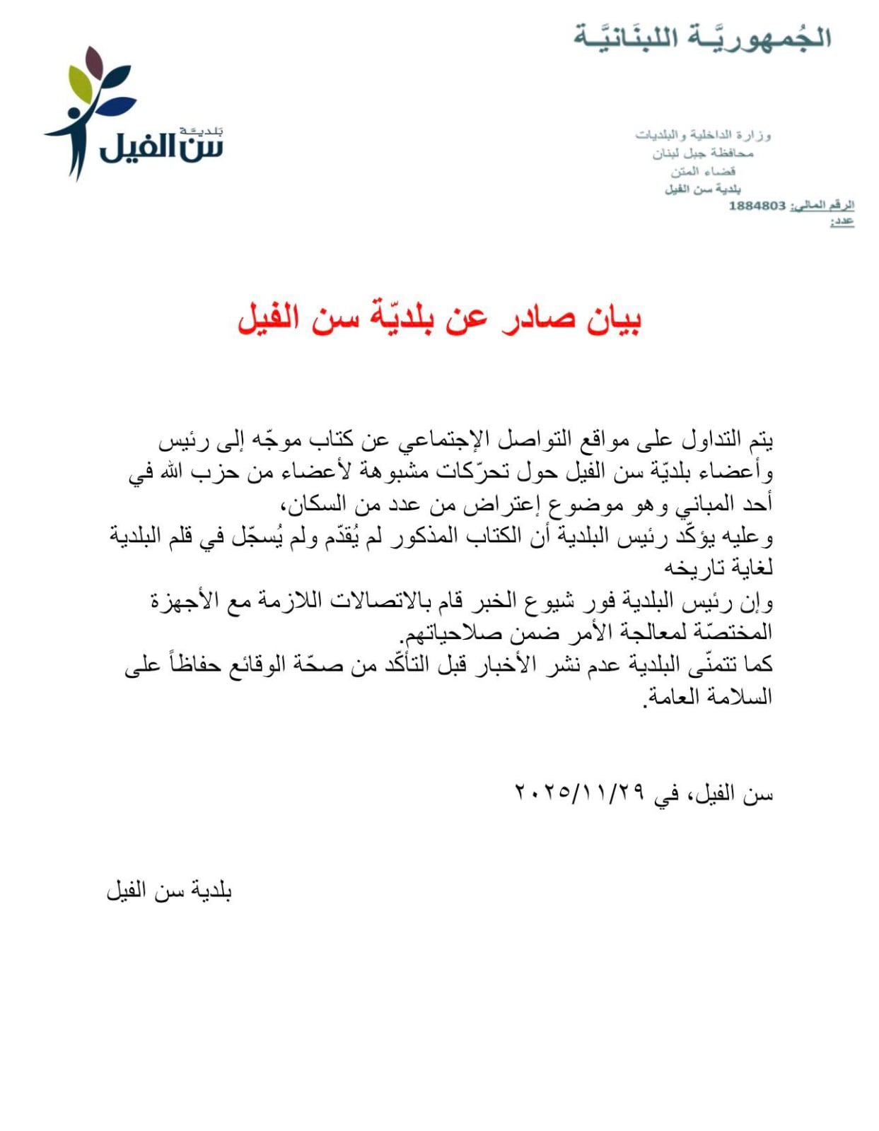 علّقت بلدية سن الفيل على ما جرى تداوله عبر مواقع التواصل الاجتماعي حول كتابٍ قيل إنه موجّه إلى رئيس وأعضاء المجلس البلدي بشأن تحركات لأعضاء من "حزب الله" داخل أحد المباني في البلدة، وهو ما أثار اعتراضًا لدى عدد من السكان، وفق ما ورد في بيان توضيحي نشرته البلدية على صفحتها الرسمية عبر "فيسبوك".