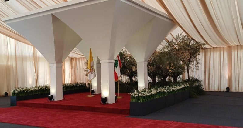 اكتمال التحضيرات في مبنى كبار الزوار في مطار رفيق الحريري الدولي في بيروت لاستقبال البابا لاون الرابع عشر، بزينة من زهرة النارسيس وأشجار الزيتون وسجاد أحمر ومنصات وخيم مخصّصة للإعلاميين من لبنان والعالم