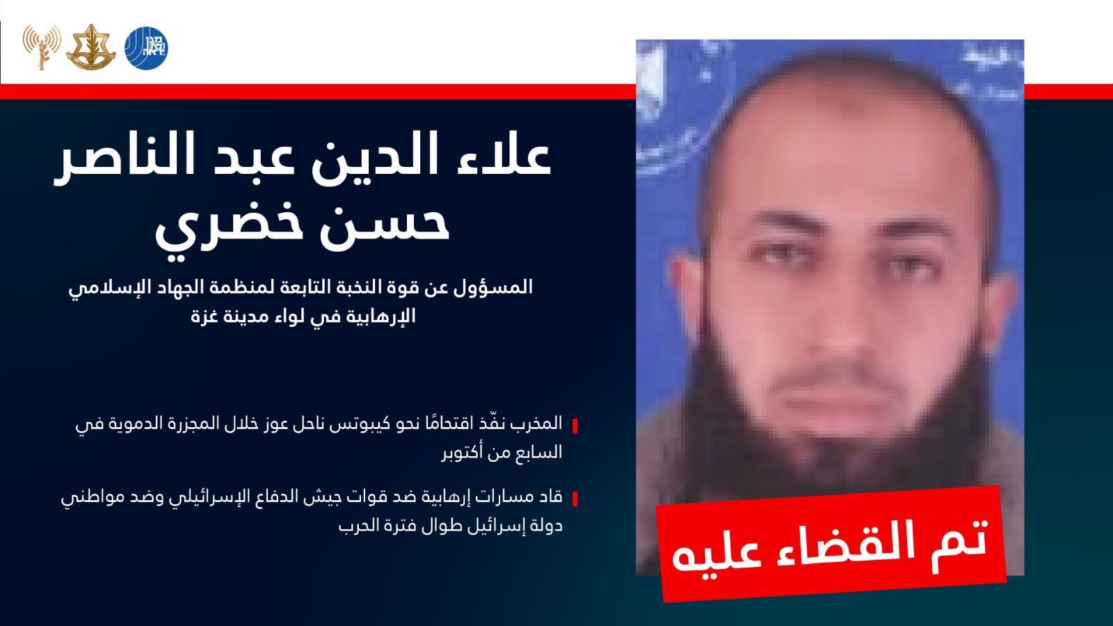 وفي سياق موازٍ، أعلن الجيش الإسرائيلي أنه تمّ القضاء في إحدى الغارات على قطاع غزة على علاء الدين عبد الناصر حسن خضري، الذي شغل منصب مسؤول "قوات النخبة" التابعة لحركة الجهاد الإسلامي في لواء مدينة غزة.