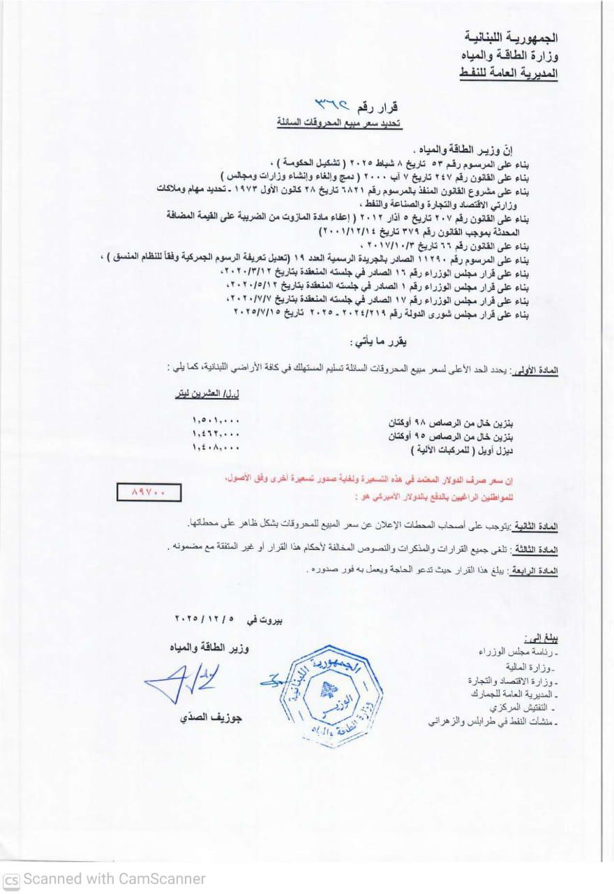 صدر عن وزارة الطاقة والمياه صباح اليوم الثلاثاء, جدولٌ جديد للمحروقات، وجاءت الأسعار على الشّكل التالي: