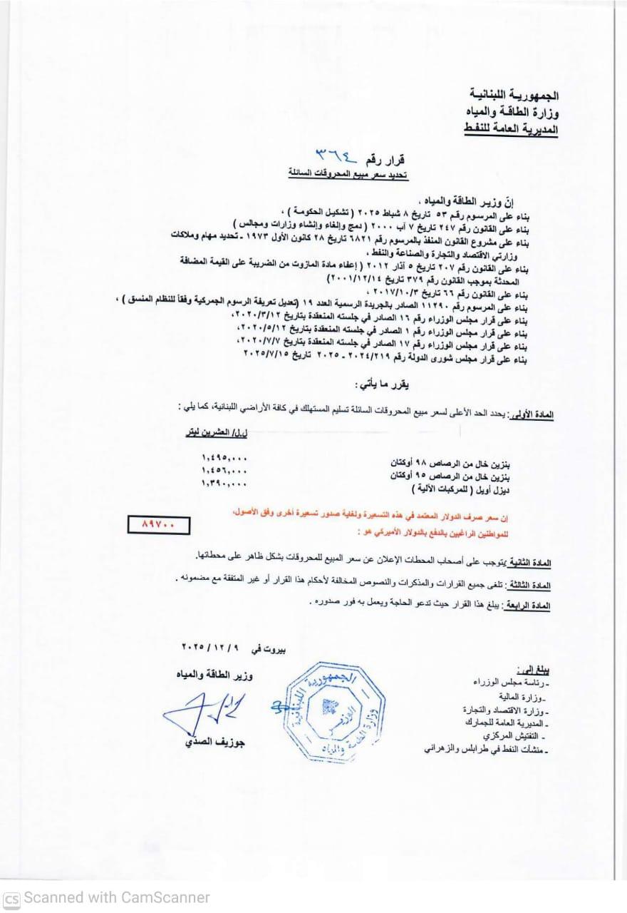 صدر عن وزارة الطاقة والمياه صباح اليوم الثلاثاء, جدولٌ جديد للمحروقات، وجاءت الأسعار على الشّكل التالي: