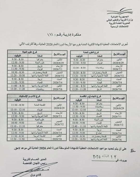 وأكدت المديرية العامة للتربية أنّ هذه الجداول تمثّل المواعيد النهائية للامتحانات الرسمية، داعية الطلاب والإدارات المدرسية إلى الالتزام الكامل بها، مع الإشارة إلى أنّ أي تعديلات لاحقة سيتم الإعلان عنها رسميًا.