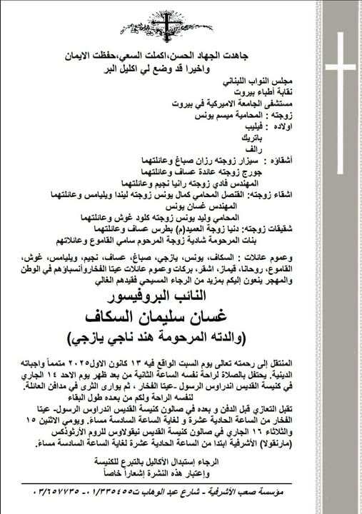 تقبل التعازي قبل الدفن وبعده في صالون كنيسة القديس اندراوس الرسول - عيتا الفخار من الساعة الحادية عشرة ولغاية الساعة السادسة مساء، ويوميّ الإثنين والثلاثاء 15 و16 الجاري، في صالون كنيسة القديس نيقولاوس للروم الأرثوذكس (مار نقولا) الأشرفية، إبتداءً من الساعة الحادية عشرة ولغاية السادسة مساءً.