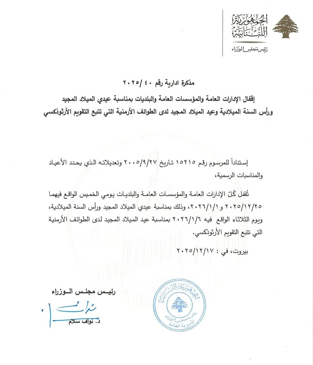 اصدر رئيس مجلس الوزراء نواف سلام مذكرة ادارية قضت بإقفال كل الإدارات العامة والمؤسسات العامة والبلديات يومي الخميس الواقع فيهما ۲۰٢٥/١٢/٢٥ و ۲۰۲۹/۱/۱ ، وذلك بمناسبة عيدي الميلاد المجيد ورأس السنة الميلادية، ويوم الثلاثاء الواقع فيه ۲۰۲٦/١/٦ بمناسبة عيد الميلاد المجيد لدى الطوائف الأرمنية التي تتبع التقويم الأرثوذكسي.