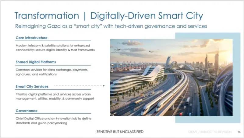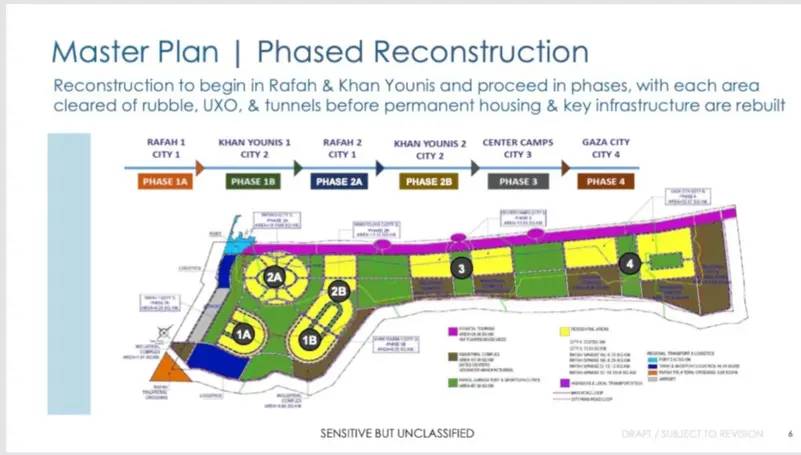 وبحسب ما كشفت وول ستريت جورنال، أعدّ فريق يقوده جاريد كوشنر، صهر ترامب، إلى جانب مبعوث الشرق الأوسط ستيف ويتكوف، مسودة مقترح من 32 صفحة على شكل عرض باوربوينت، تتضمن صوراً لناطحات سحاب ساحلية، ورسومات بيانية وجداول كلفة، وخارطة طريق طويلة الأمد لإعادة إعمار القطاع.