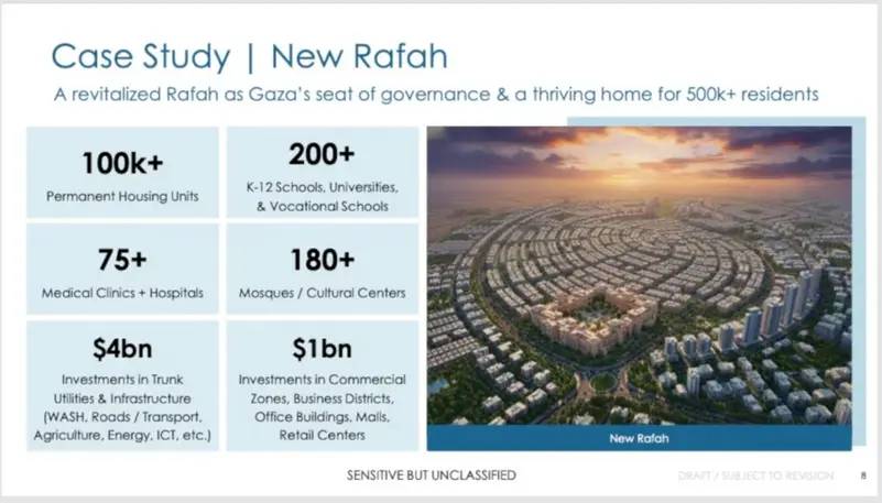 وتُظهر إحدى الشرائح، المعنونة بـ"رفح الجديدة"، تصوراً لتحويلها إلى مقر حكم للقطاع، يضم أكثر من 500 ألف نسمة، مع 100 ألف وحدة سكنية، و200 مدرسة، وأكثر من 75 منشأة طبية، إلى جانب مساجد ومراكز ثقافية.