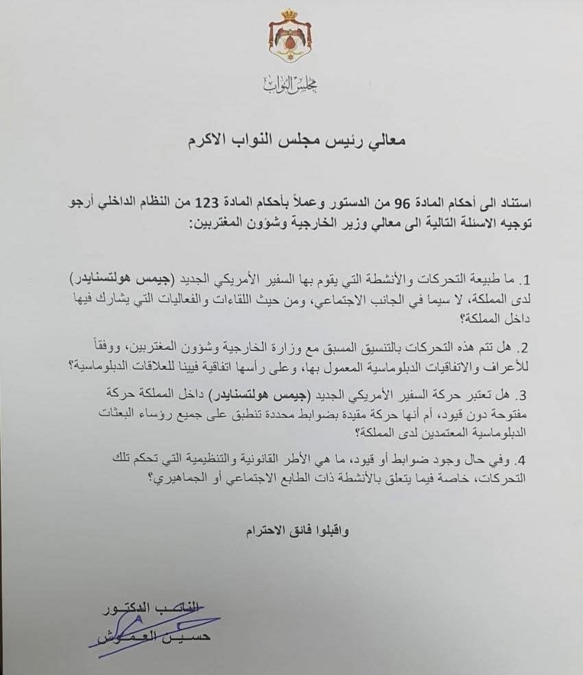 وتساءل العموش عن طبيعة التحركات والأنشطة التي يقوم بها السفير الأميركي الجديد، ولا سيما على الصعيد الاجتماعي، كما سأل عن مدى تنسيق هذه التحركات مع وزارة الخارجية. وطرح سؤالًا إضافيًا وصف بالمثير، متسائلًا عمّا إذا كانت حركة السفير داخل المملكة مفتوحة من دون قيود، أم أنها خاضعة لضوابط محددة تسري على جميع رؤساء البعثات الدبلوماسية المعتمدين لدى الأردن.
