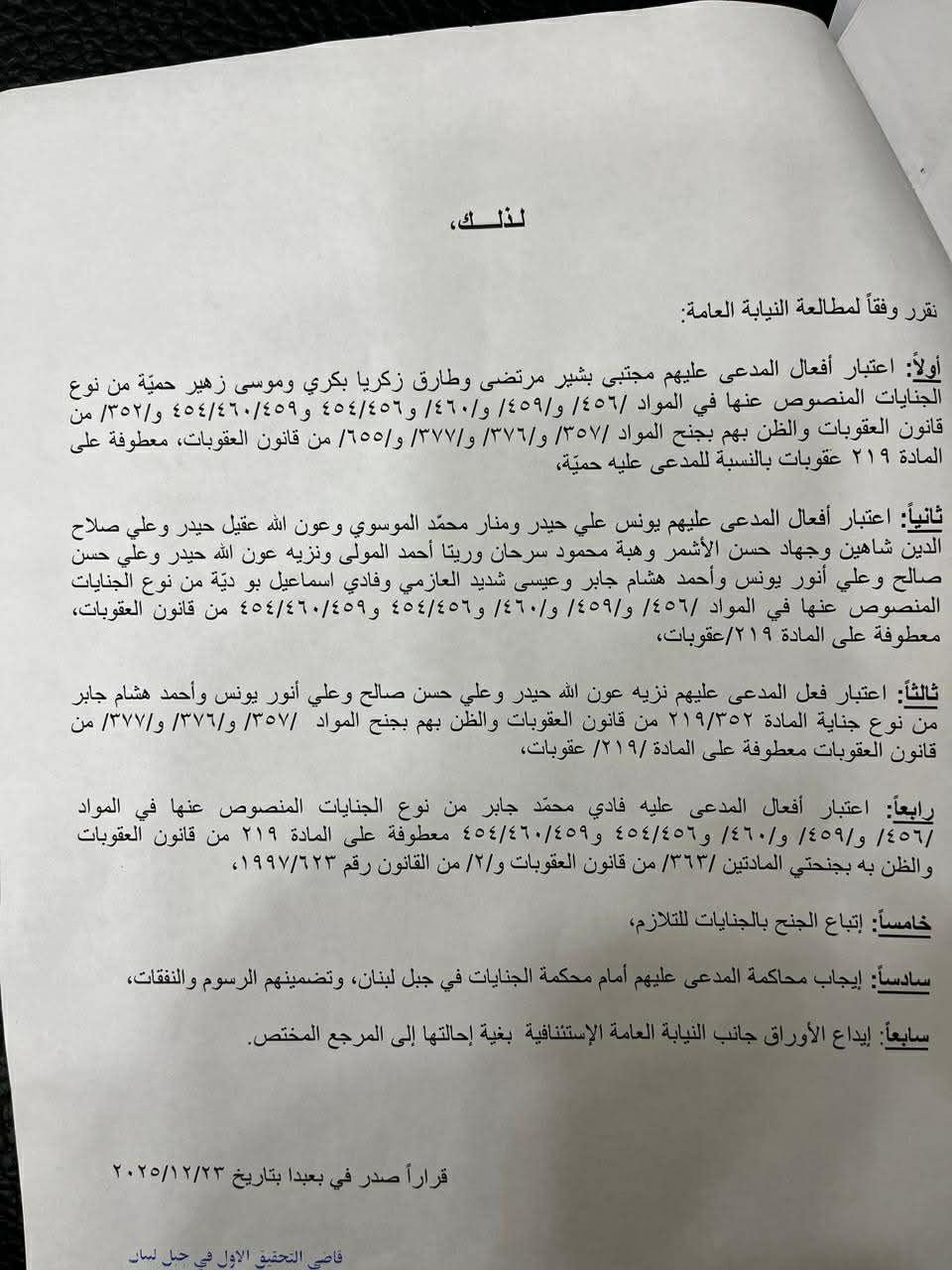 أولاً: اعتبار أفعال المدعى عليهم مجتبى بشير مرتضى وطارق زكريا بكري وموسى زهير حمية من نوع الجنايات المنصوص عنها في المواد / 456 / و / 459 / و / 460 / و 454/456 و 454/460/459 و / 352 / من قانون العقوبات والظن بهم بجنح المواد / 357 / و / 376 / و / 377 / و / 655 / من قانون العقوبات، معطوفة على المادة 219 عقوبات بالنسبة للمدعى عليه حمية.