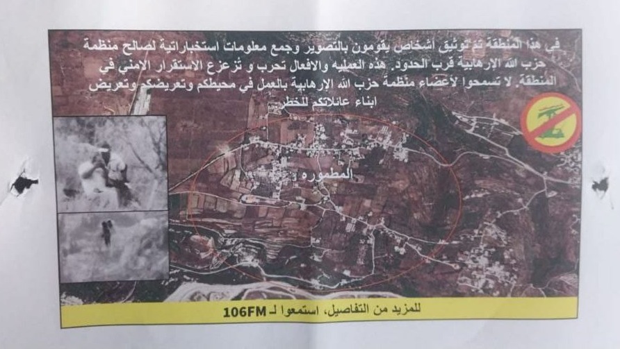 وفي سياق متصل، عُثر في محيط المنطقة على منشور تحذيري تَضمّن نصًا يتّهم أشخاصًا بالتصوير وجمع معلومات استخبارية قرب الحدود، بزعم أنّ ذلك يتمّ لصالح حزب الله.