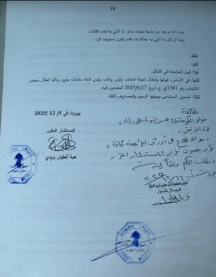 وتضمّن التقرير قبول المراجعة شكلًا وأساسًا، وإبطال نتيجة انتخاب رئيس ونائب رئيس اتحاد بلديات جزين، وبالتالي إبطال محضر الانتخاب في 17 حزيران 2025، الذي فاز بنتيجته رئيس بلدية لبعا بسام رومانوس برئاسة الاتحاد، ورئيس بلدية كرخا جان نخلة بنيابة الرئاسة.