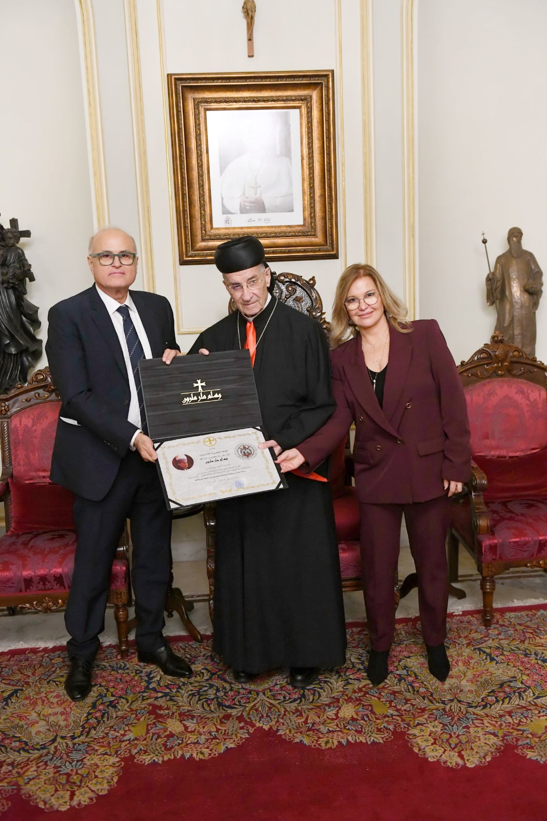 وجرى تقليد إشارات الوسام وتسليم براءته، التي تلاها المسؤول الإعلامي ومدير البروتوكول المحامي وليد غياض، خلال لقاء عائلي أُقيم في الصرح البطريركي في بكركي.
