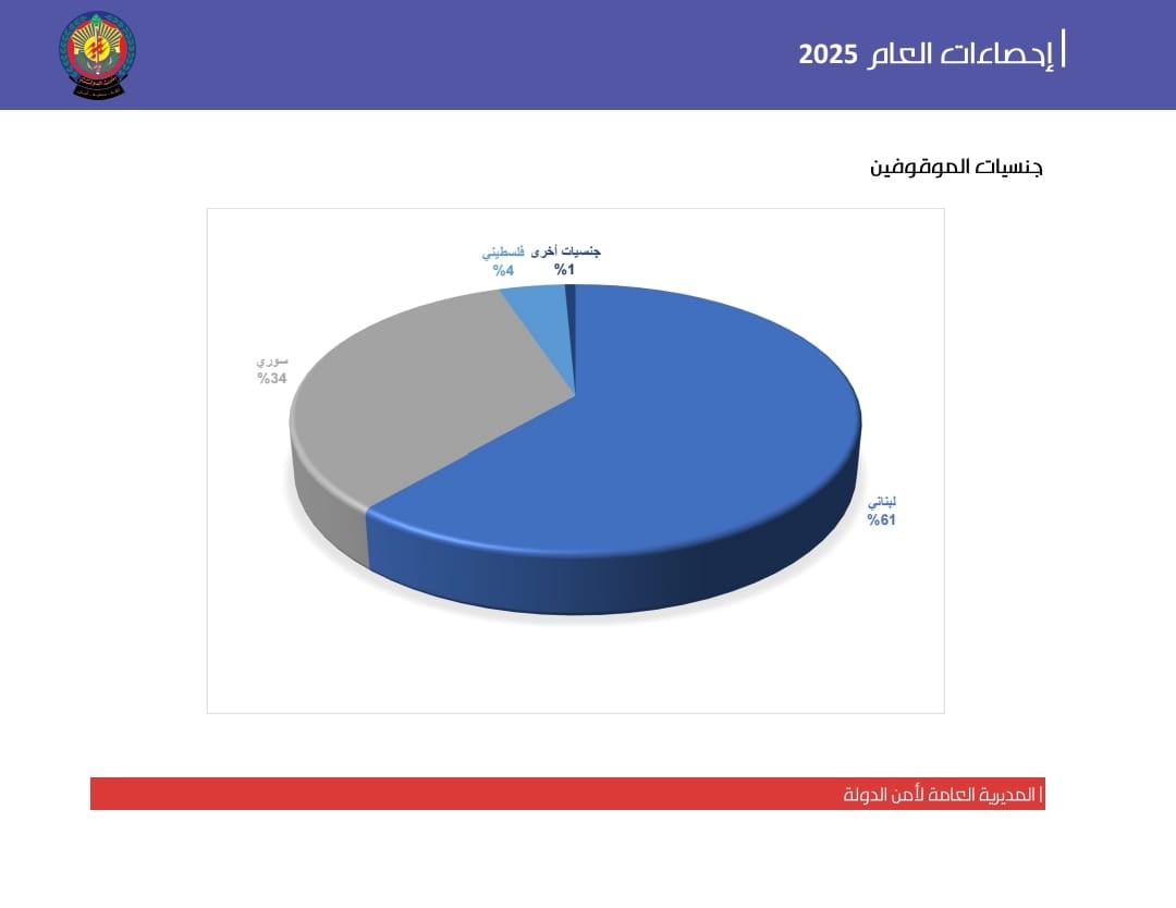 صدر عن المديرية العامة لأمن الدولة – قسم الإعلام والتوجيه والعلاقات العامة، بيان جاء فيه: "أصدرت المديرية العامة لأمن الدولة تقريرها الإحصائي السنوي لعام 2025، متضمّنًا حصيلة شاملة لنشاطاتها الأمنية على امتداد الأراضي اللبنانية، في إطار جهودها المتواصلة لتعزيز الأمن والاستقرار، ومكافحة الجريمة المنظمة والفساد، وحماية المال العام".