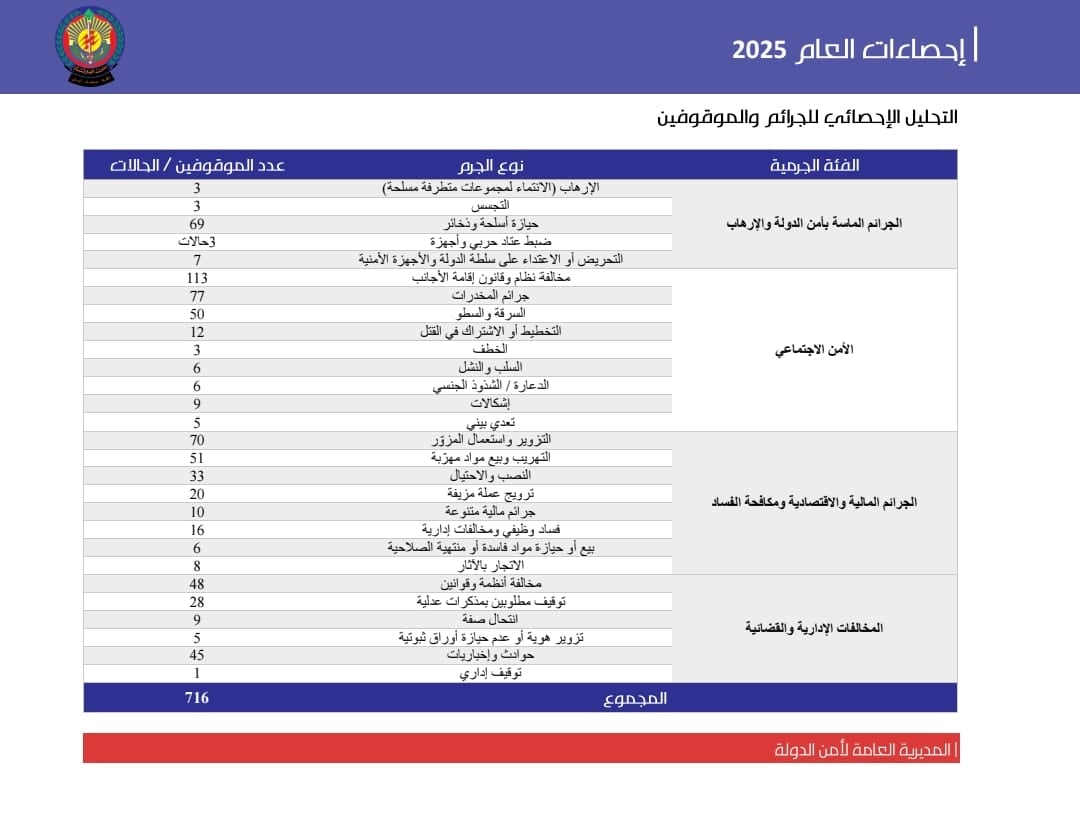 وختم البيان، "وأكدت المديرية العامة لأمن الدولة في ختام تقريرها استمرارها في أداء مهامها وفق القوانين والأنظمة المرعية الإجراء، والتزامها بملاحقة الجرائم بمختلف أشكالها، بما يسهم في تعزيز الأمن وحماية الاستقرار العام".