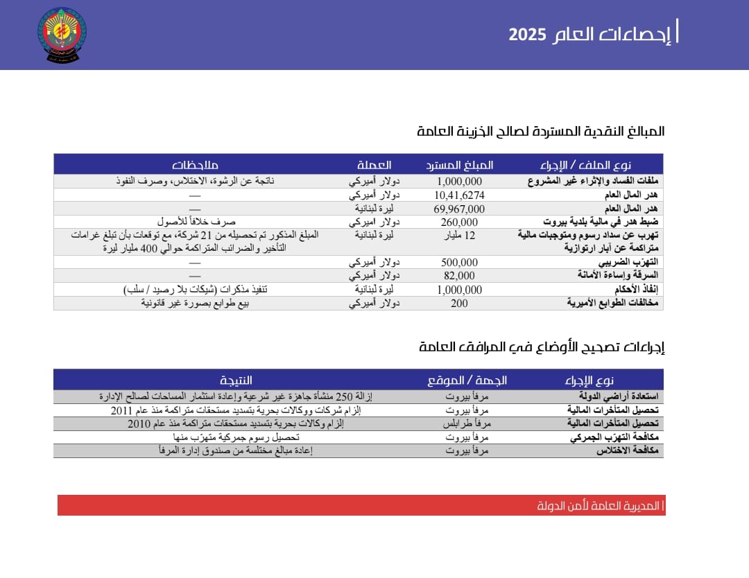 وتابع، "كما أشار التقرير إلى تمكن المديرية العامة من استرجاع عشرات ملايين الدولارات، فضلًا عن مبالغ كبيرة بالليرة اللبنانية، أُودعت في الخزينة العامة، وذلك في سياق جهودها الرامية إلى صون المال العام وملاحقة مرتكبي جرائم التعدي على المال العام".