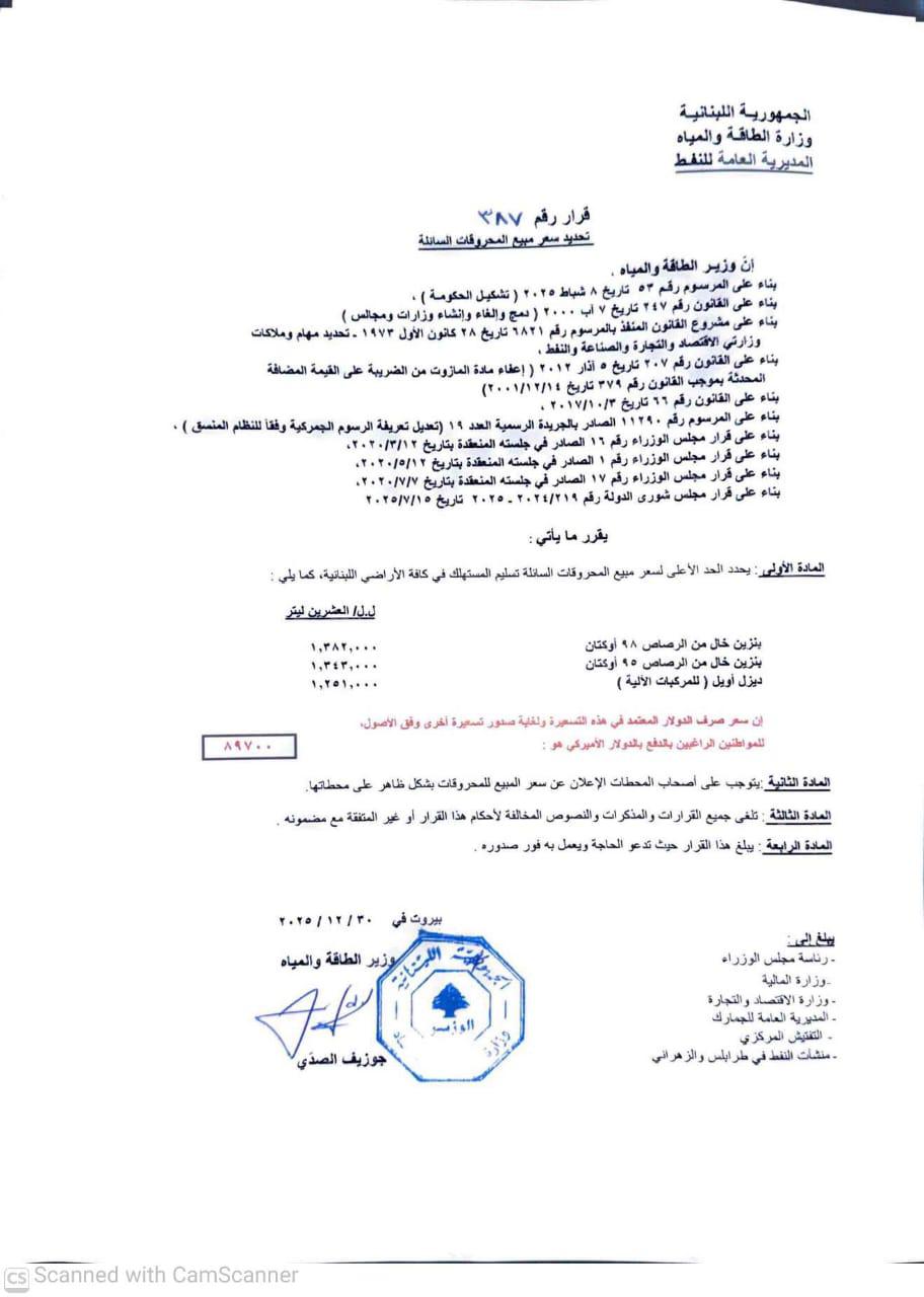 صدر عن وزارة الطاقة والمياه صباح اليوم الثلاثاء, جدولٌ جديد للمحروقات، وجاءت الأسعار على الشّكل التالي: