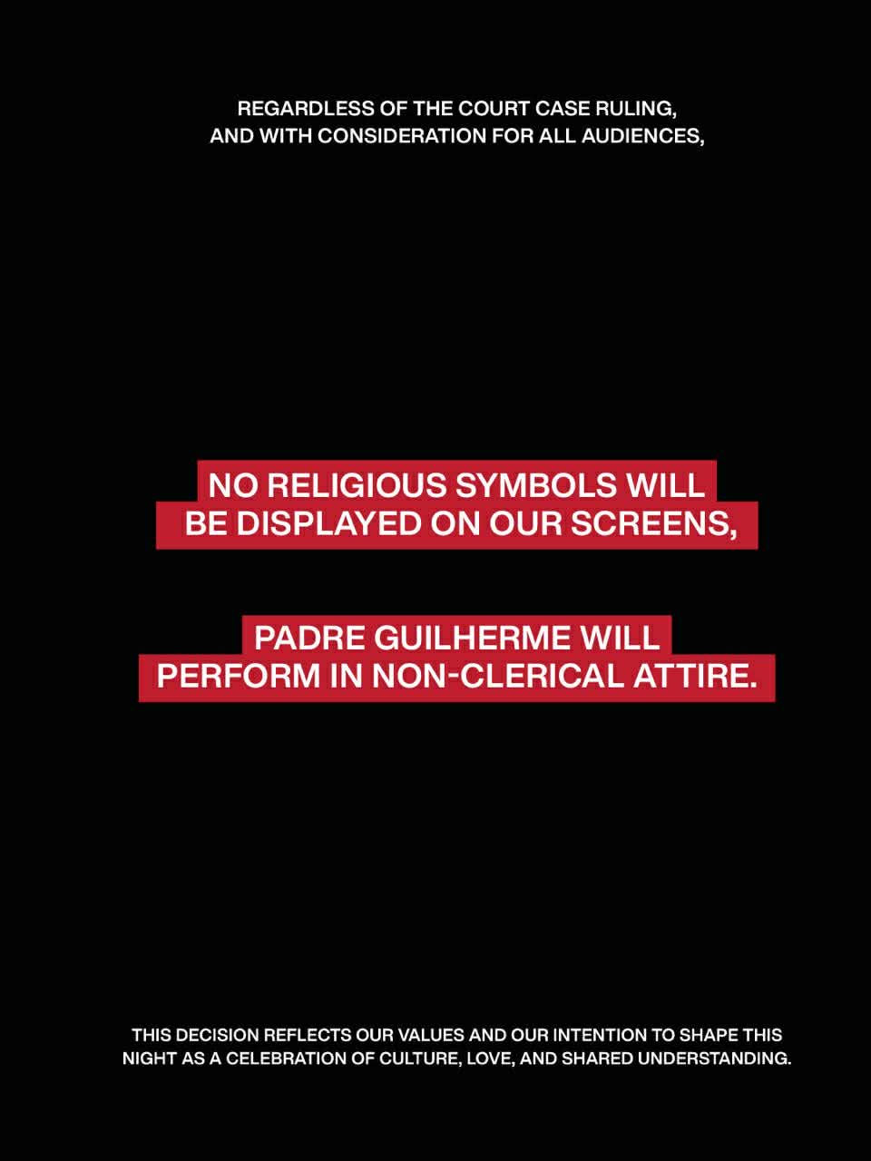 "بغضّ النظر عن قرار المحكمة، ومراعاةً لجميع فئات الجمهور، لن يتم عرض أي رموز دينية على شاشاتنا، وسيُقدّم بادري غييرمي عرضه بملابس غير كهنوتية. يعكس هذا القرار قيمنا ورغبتنا في أن تكون هذه الليلة احتفالًا بالثقافة، والمحبة، والتفاهم المشترك".