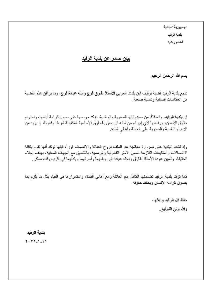 أصدرت بلدية الرفيد بيانًا أعلنت فيه متابعتها الحثيثة لقضية توقيف ابن البلدة المربّي الأستاذ طارق فرج ونجله عيادة، المحتجزَين على الأراضي الأردنية، مؤكدةً أنّ القضية ترتّب انعكاسات إنسانية ونفسية صعبة على العائلة وأهالي البلدة.