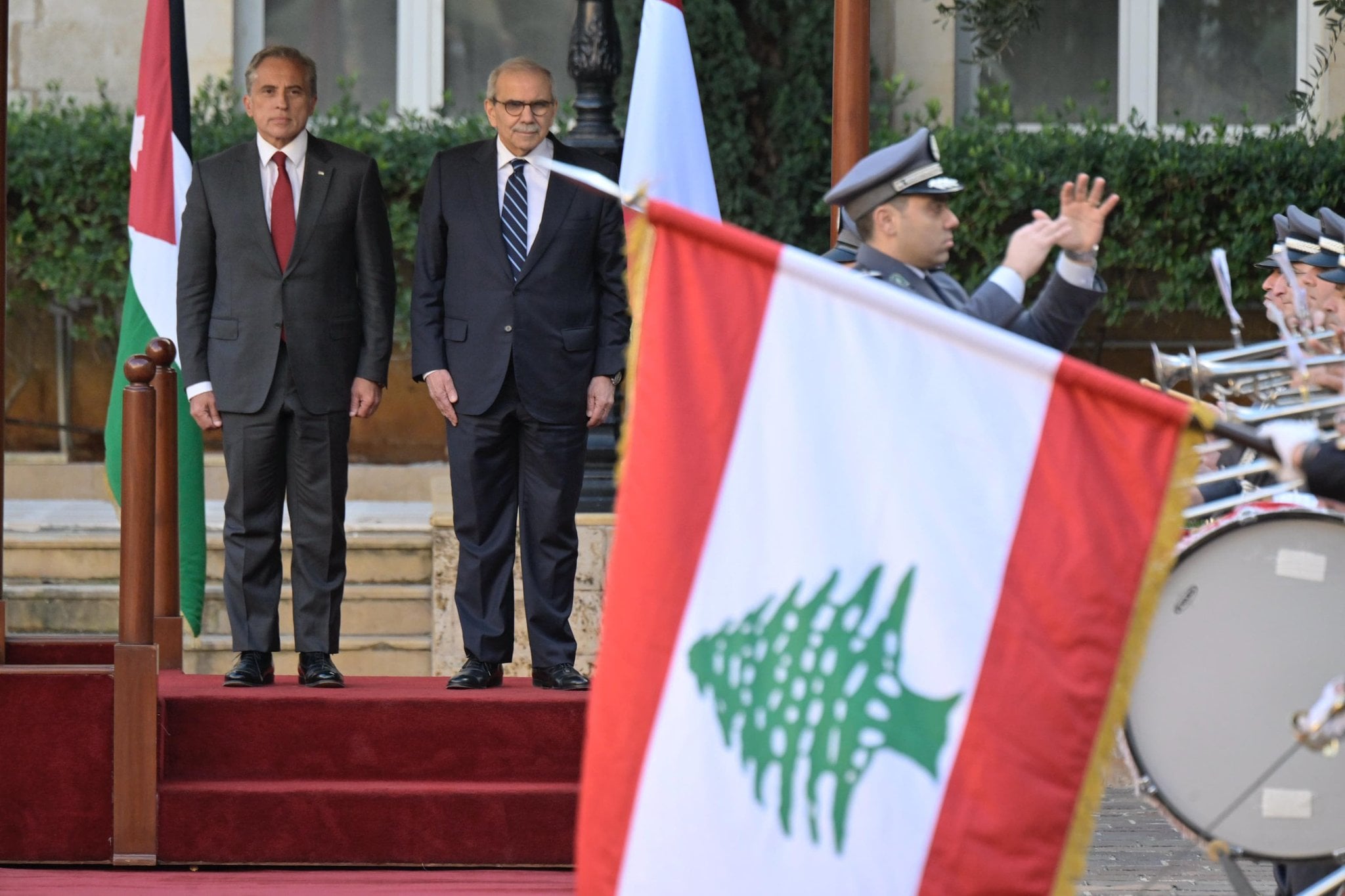 وكان الرئيس حسان قد وصل إلى السرايا قرابة الساعة الثالثة والنصف بعد الظهر، يرافقه رئيس بعثة الشرف وزير الأشغال العامة والنقل فايز رسامني، حيث كان في استقباله الرئيس سلام. وأقيمت مراسم الاستقبال الرسمية، فعزفت موسيقى قوى الأمن الداخلي النشيدين الوطنيين اللبناني والأردني، ثم استعرض الرئيسان ثلّة من حرس رئاسة الحكومة، قبل أن يصافحا أعضاء الوفدين اللبناني والأردني.