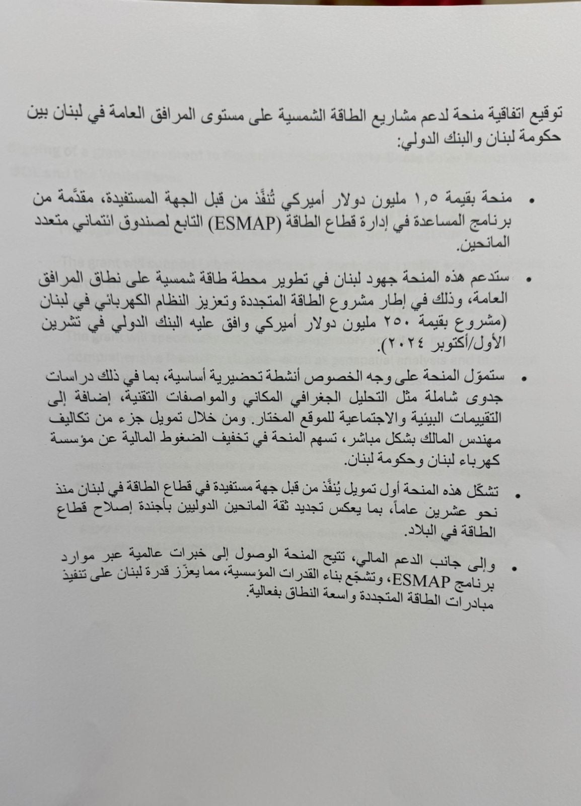 وتهدف المنحة، المقدّمة عبر برنامج المساعدة في إدارة قطاع الطاقة ESMAP التابع لصندوق ائتماني متعدّد المانحين، إلى دعم الجهود اللبنانية في تطوير محطة طاقة شمسية على نطاق المرافق العامة، ضمن إطار مشروع الطاقة المتجددة وتعزيز النظام الكهربائي في لبنان، الذي تبلغ قيمته 250 مليون دولار وكان قد نال موافقة البنك الدولي في تشرين الأول 2024.