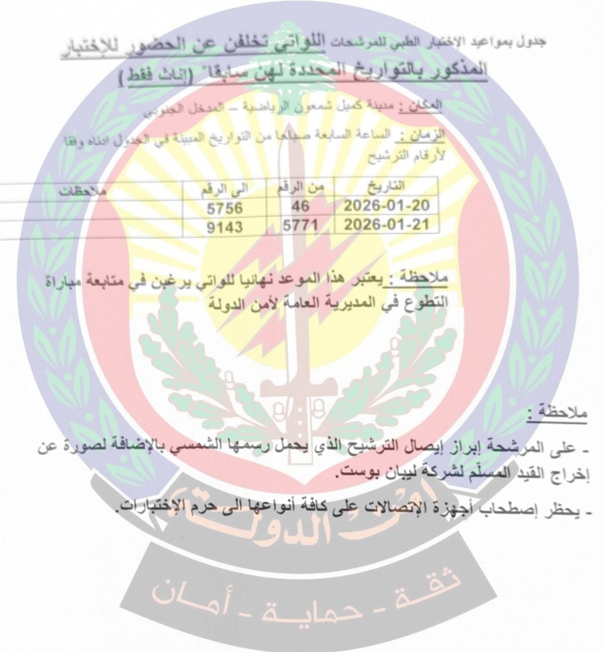 صدر عن المديرية العامة لأمن الدولة – قسم الإعلام والتوجيه والعلاقات العامة، بيان جاء فيه: "إلحاقًا لبيانها السابق المتعلّق بمواعيد الاختبار الطبي للمرشّحات المتطوّعات لرتبة مأمور متمرّن (إناث فقط)، تعلن المديرية العامة لأمن الدولة عن جدول جديد بمواعيد الاختبار الطبي للمرشحات اللواتي تخلّفن عن حضور الاختبار المذكور بالتواريخ المحددة لهن سابقاً (إناث فقط)، في مدينة كميل شمعون الرياضية – المدخل الجنوبي، عند الساعة السابعة صباحًا، وذلك وفقًا لأرقام الترشيح والتواريخ المذكورة أدناه".