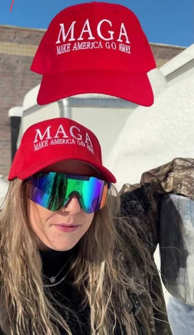 وبدلًا من عبارة "اجعل أميركا عظيمة مرة أخرى" (MAGA)، كُتبت على القبعات عبارة "اجعل أميركا تغادر من هنا" (Make America Go Away)، في محاكاة ساخرة ولافتة للاختصار الأصلي.