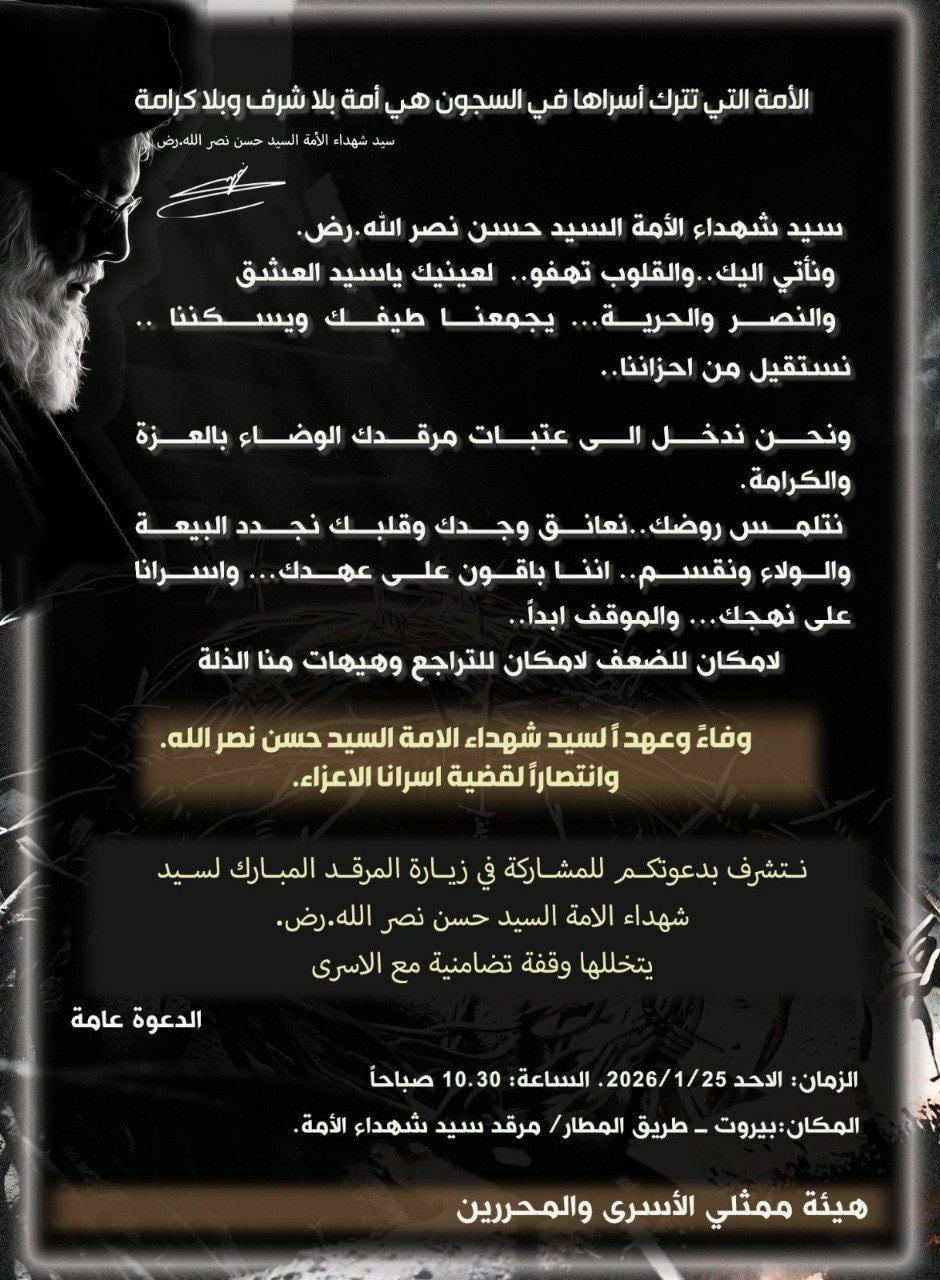 وجاء في الدعوة، التي حملت شعار "وفاءً وعهدًا لسيد شهداء الأمة السيد حسن نصر الله، وانتصارًا لقضية أسرانا الأعزاء"، أنّ الزيارة ستُقام يوم الأحد 25/1/2026 عند الساعة 10:30 صباحًا.