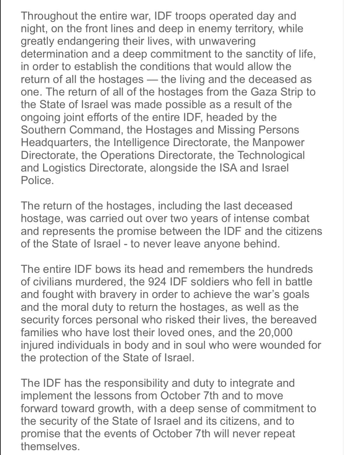 وأوضح البيان أنّ قوات الجيش عملت طوال فترة الحرب، ليلًا ونهارًا، على خطوط المواجهة وداخل عمق المناطق المعادية، مع تعريض حياتها لخطر كبير، وبإصرار والتزام راسخين بقدسية الحياة، لتهيئة الظروف التي سمحت بإعادة جميع الرهائن، أحياءً ومتوفّين، وذلك نتيجة جهود مشتركة لمختلف أذرع الجيش، ولا سيما القيادة الجنوبية، ومقر شؤون الأسرى والمفقودين، وشُعب الاستخبارات والقوى البشرية والعمليات والتكنولوجيا واللوجستيات، إلى جانب جهاز الأمن العام والشرطة الإسرائيلية.