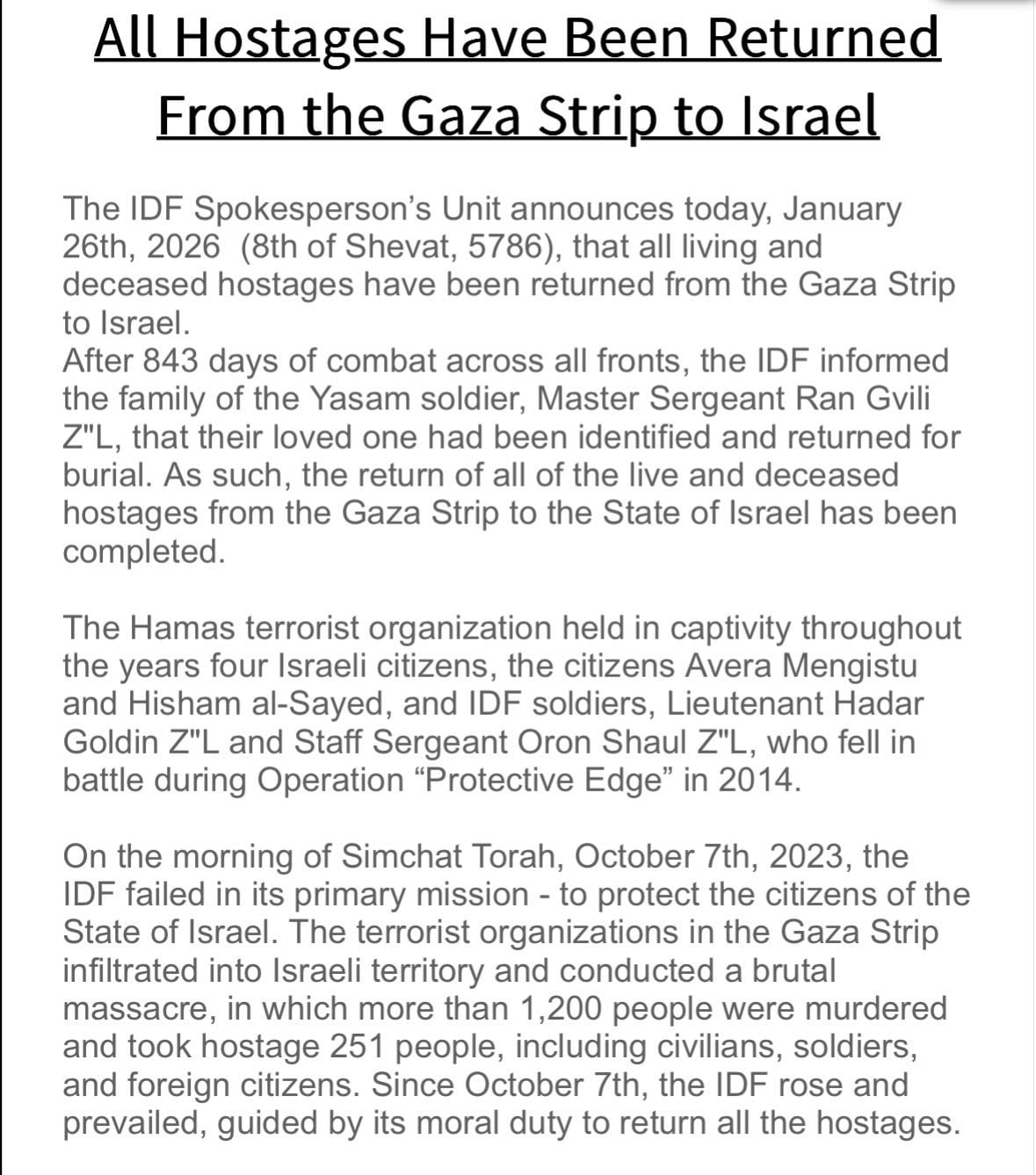 وفي سياق متصل، أعلنت وحدة المتحدث باسم الجيش الإسرائيلي، اليوم 26 كانون الثاني 2026، أنّ جميع الرهائن الأحياء والمتوفّين أُعيدوا من قطاع غزة إلى إسرائيل. وأوضح الجيش أنّه، بعد 843 يومًا من القتال على مختلف الجبهات، أبلغ عائلة عنصر وحدة “يَسّام” الرقيب أول ران غفيلي (ز.ل.) التعرّف إلى رفاته وإعادته تمهيدًا لدفنه، وبذلك تكون عملية إعادة جميع الرهائن الأحياء والمتوفّين من قطاع غزة قد اكتملت.