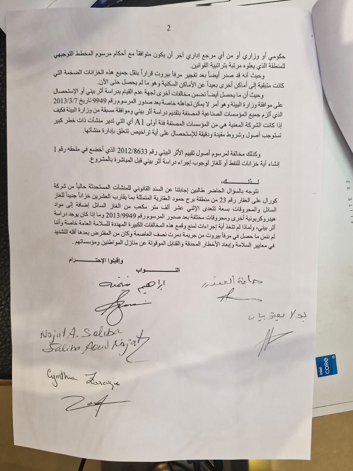 وبحسب السؤال النيابي الموقّع من النواب بولا يعقوبيان، حليمة القعقور، إبراهيم منيمنة، سينتيا زرازير، ونجاة صليبا عون، فإن الأعمال الجارية لتشييد وتوسعة منشآت تخزين الغاز من قبل شركة ذي كورال أويل كومباني ليمتد ش.م.ل. تُنفَّذ داخل نسيج عمراني كثيف السكان، وبقدرة تخزينية تُقارب 12,000 متر مكعّب من الغاز، إضافة إلى كميات كبيرة من المواد البترولية، من دون استيفاء شروط الترخيص القانونية.