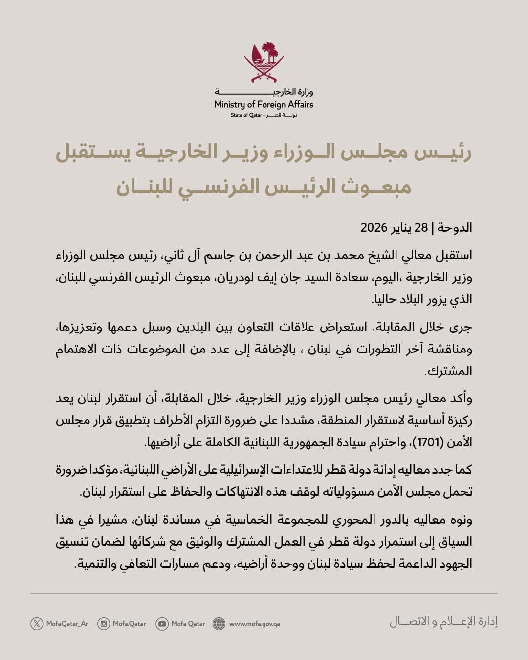 استقبل رئيس مجلس الوزراء وزير الخارجية القطري، الشيخ محمد بن عبد الرحمن بن جاسم آل ثاني، اليوم في الدوحة، مبعوث الرئيس الفرنسي إلى لبنان جان إيف لودريان.
