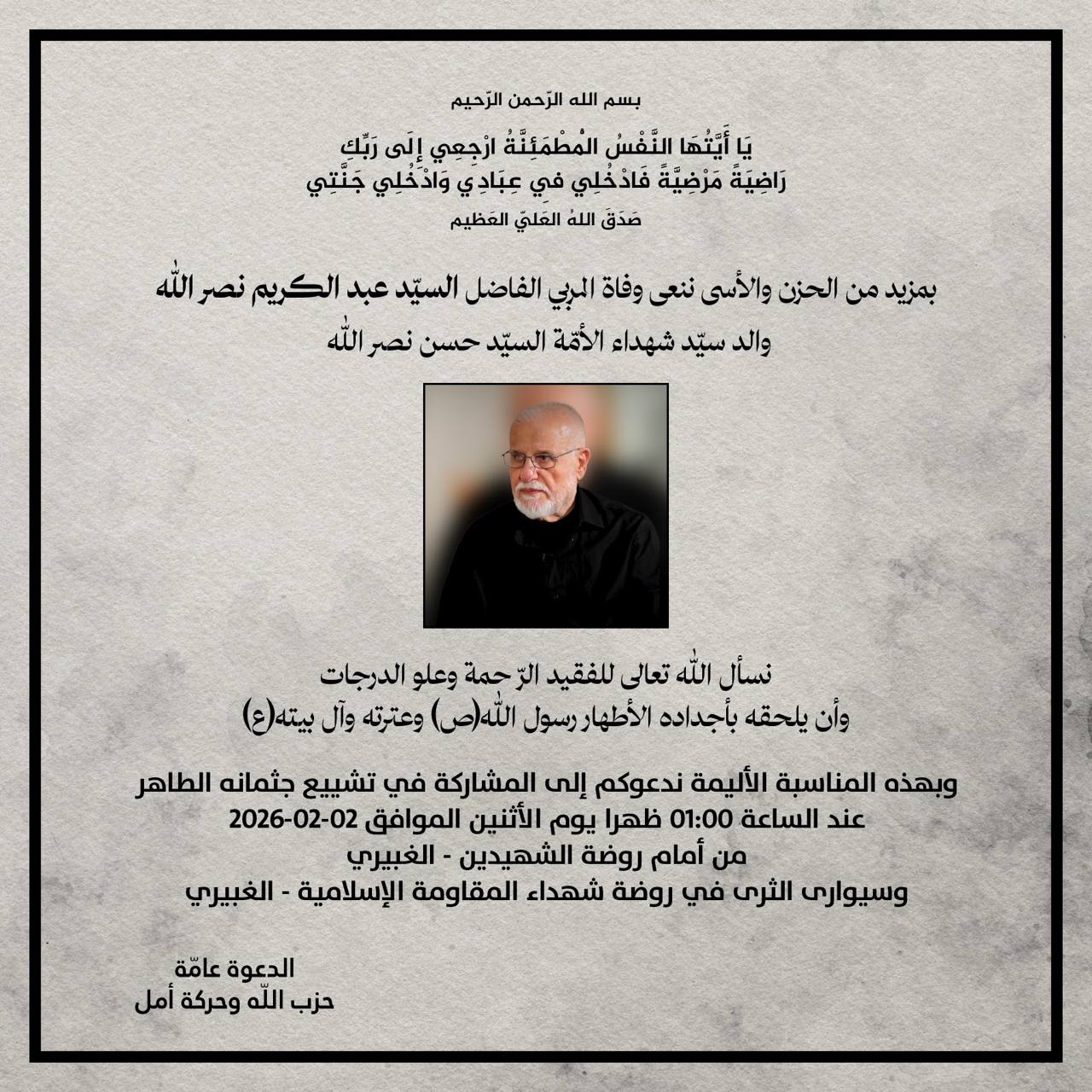 ويأتي رحيل السيد عبدالكريم نصرالله بعد نحو عام ونصف العام على اغتيال نجله السيد حسن نصرالله في 27 أيلول 2024.