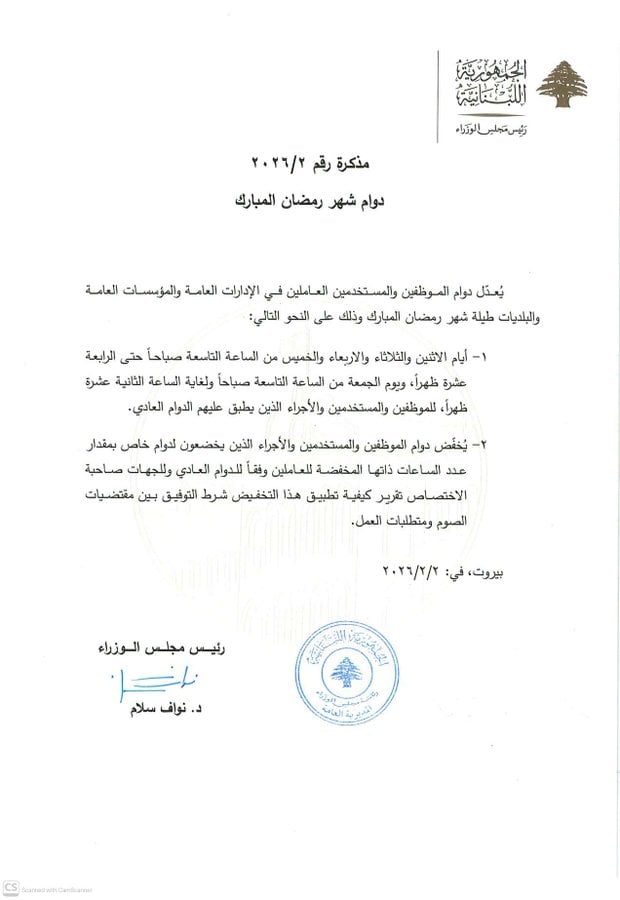 صدر عن رئيس مجلس الوزراء نواف سلام مذكرة حملت الرقم 2/2026، تتعلّق بتنظيم دوام شهر رمضان المبارك في الإدارات العامة والمؤسسات العامة والبلديات.