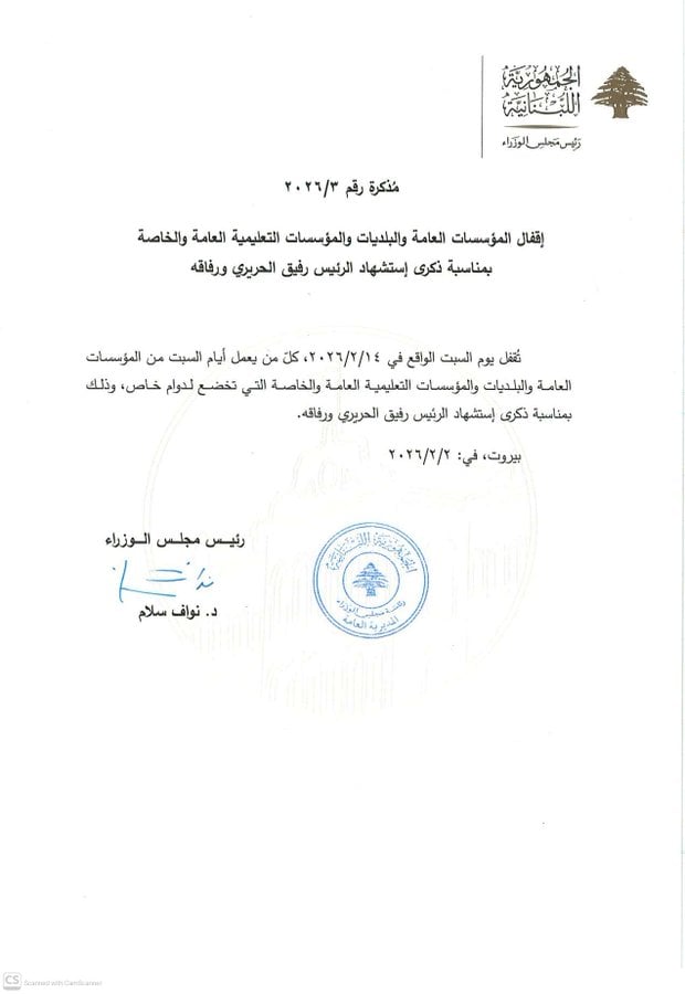 وجاء في المذكرة أنّه تُقفل يوم السبت الواقع فيه 14/2/2026، كل المؤسسات العامة والبلديات والمؤسسات التعليمية العامة والخاصة التي تعمل أيام السبت وتخضع لدوام خاص، وذلك إحياءً لذكرى استشهاد الرئيس رفيق الحريري ورفاقه.