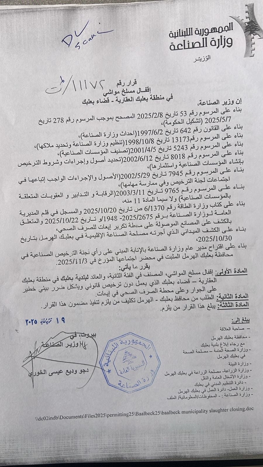 تزداد خطورة هذه القضية في ضوء ثبوت أن التعدّي الموثّق لا يجري في فراغ قانوني. فبتاريخ 19 تشرين الثاني 2025، أصدرت وزارة الصناعة القرار رقم 11172/ت القاضي بإقفال مسلخ المواشي المصنّف ضمن الفئة الثانية، والعائد لبلدية بعلبك، والكائن في منطقة بعلبك العقارية، وذلك لعمله من دون ترخيص قانوني، ولتسببه بأضرار بيئية جسيمة تطال الجوار وتهدّد السلامة البيئية لمحطة الصرف الصحي في إيعات. كما تضمّن القرار تكليف محافظ بعلبك – الهرمل اتخاذ الإجراءات اللازمة لتنفيذه وفقًا للأصول. للاطلاع على قرار وزارة الصناعة اضغط هنا