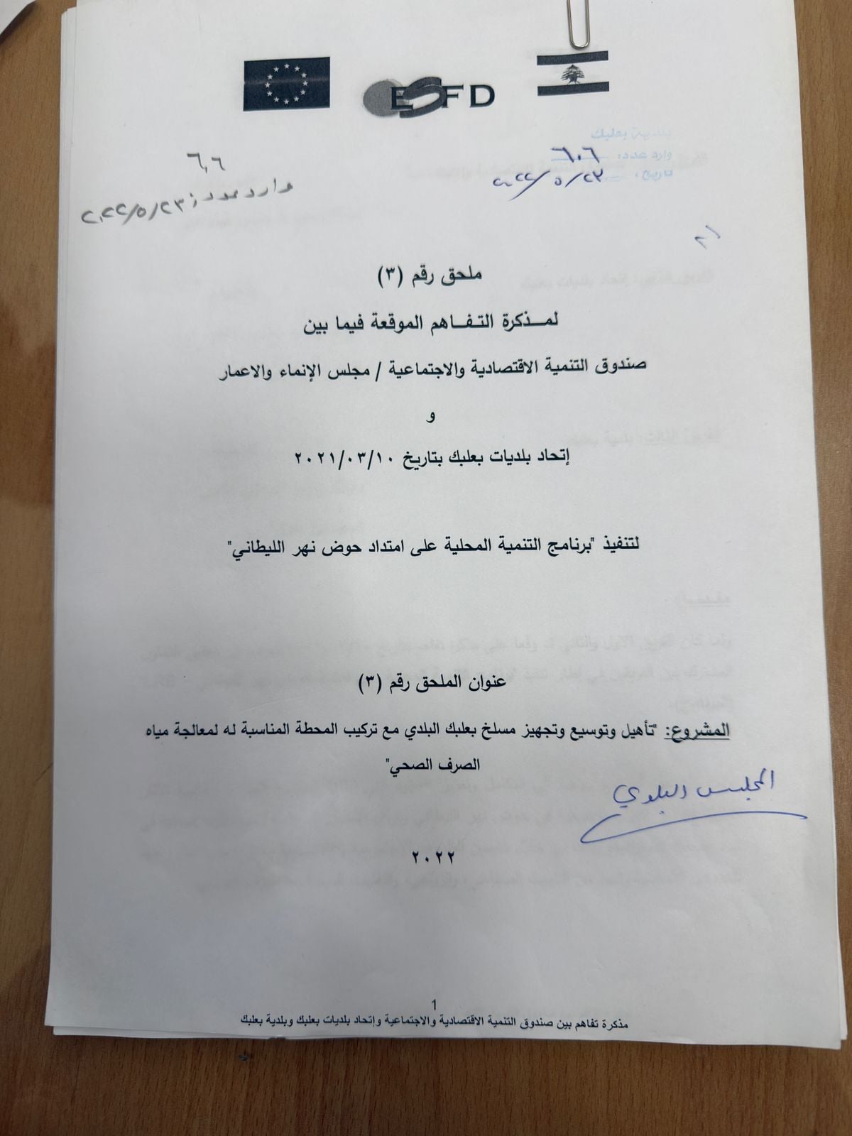 كما قرّرت بلدية بعلبك، في جلستها المنعقدة بتاريخ 26 آذار 2021، قبول الهبة المقدّمة من صندوق التنمية الاقتصادية والاجتماعية لتنفيذ هذا المشروع، مع التزامها استلامه وإدارته وتشغيله وفق الأصول الفنية والقانونية، وبما يضمن الشفافية وحسن الإدارة وتحقيق الأهداف البيئية التي أُنشئ من أجلها. غير أن الوقائع الثابتة اليوم تُظهر أن هذه الالتزامات بقيت حبرًا على ورق، وأن المشروع لم يؤدِّ إلى وقف التعدّيات، بل استمر تصريف الملوّثات إلى الشبكات العامة من دون أي معالجة مسبقة، في مخالفة واضحة لمضمون مذكرة التفاهم وشروطها.