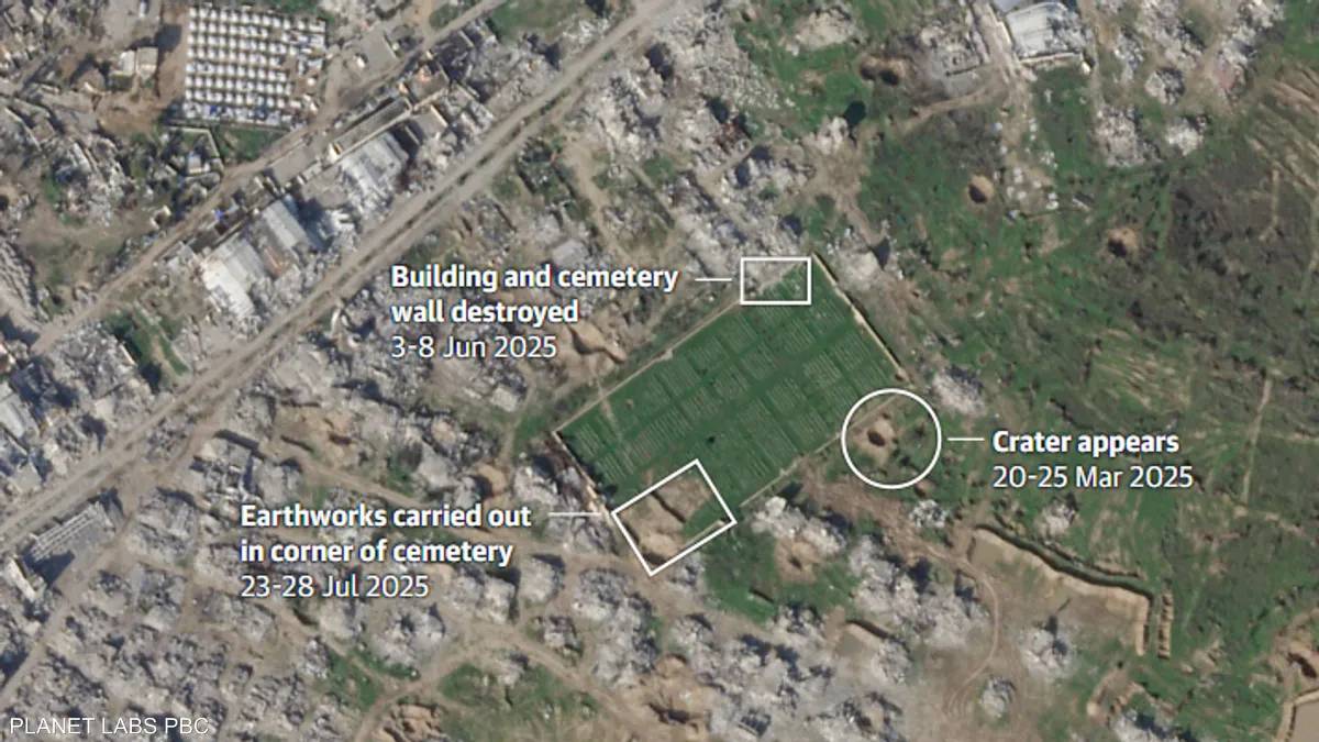 وبحسب صحيفة The Guardian البريطانية، تكشف الصور الملتقطة للمقبرة الواقعة في حي التفاح في غزة عن عمليات حفر وتسوية واسعة النطاق في الزاوية الجنوبية الغربية للموقع.