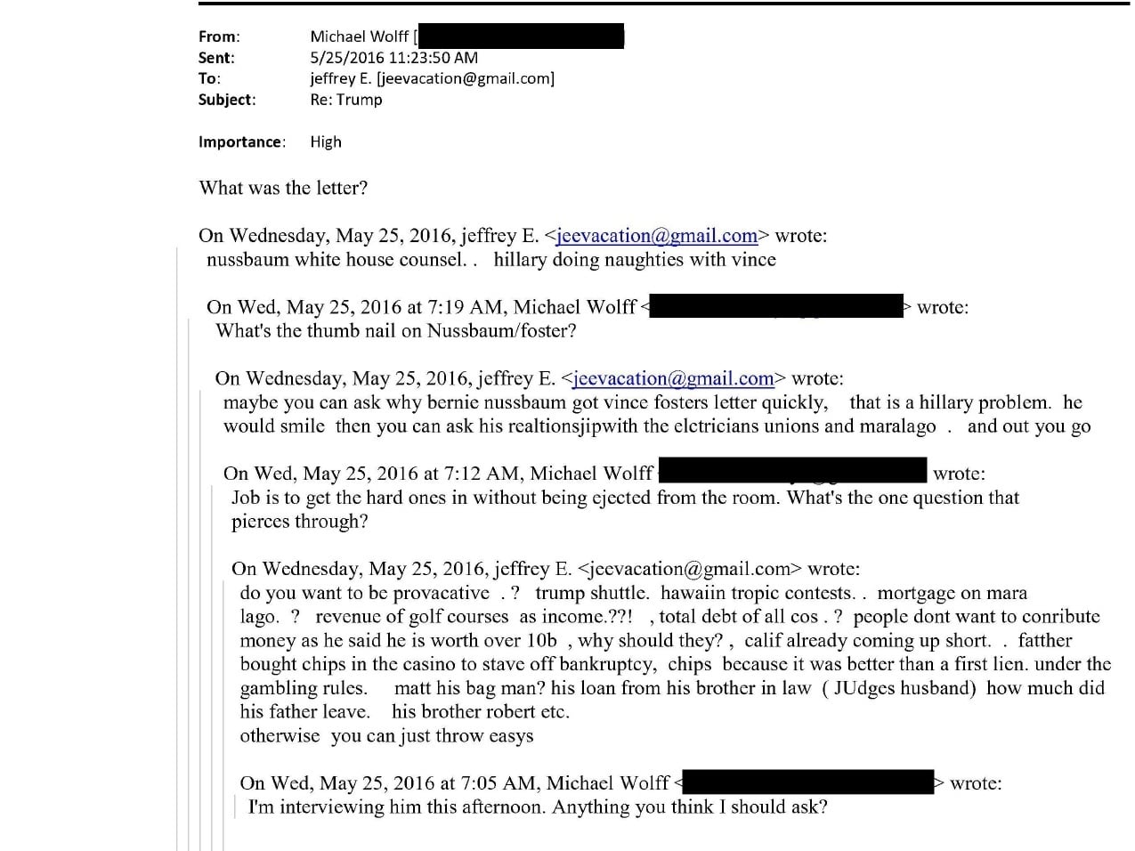 ووفق ما ورد في مراسلات إلكترونية متبادلة بتاريخ 25 أيار 2016 بين الكاتب مايكل وولف وإبستين، والتي أُدرج فيها اسم الرئيس الأميركي دونالد ترامب كمستلم، جاء أنّ “هيلاري تفعل أشياء غير لائقة مع فينس”. كما ردّ إبستين على طلب وولف تلخيص ما حصل مع فوستر بالقول: “ربما يمكنك أن تسأل لماذا حصل بيرني نوسباوم على رسالة فينس فوستر بسرعة، فهذه مشكلة هيلاري”، مضيفًا إشارات إلى علاقات أخرى.