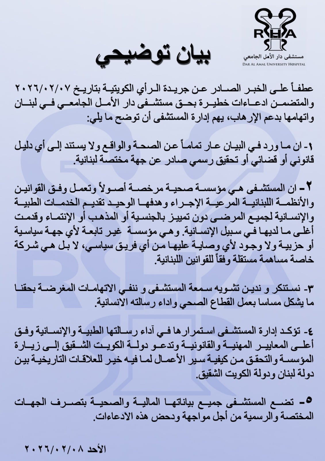 صدر عن إدارة مستشفى دار الأمل الجامعي بيان توضيحي، عطفًا على الخبر الصادر عن جريدة الرأي بتاريخ 07/02/2026، والمتضمّن ادعاءات واتهامات بدعم الإرهاب بحق المستشفى.