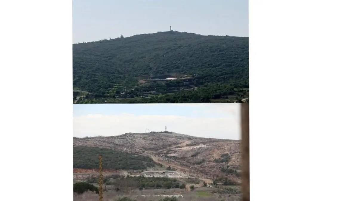 وأرفق هاني الصورة بتعليق قال فيه: "تلة الراهب الحدودية قبل وبعد العدوان، تجريف وحرق ورش بالمبيدات للغابات والأراضي الزراعية"، في إشارة إلى حجم الدمار الذي طال الغطاء الأخضر والأراضي الزراعية في المنطقة.