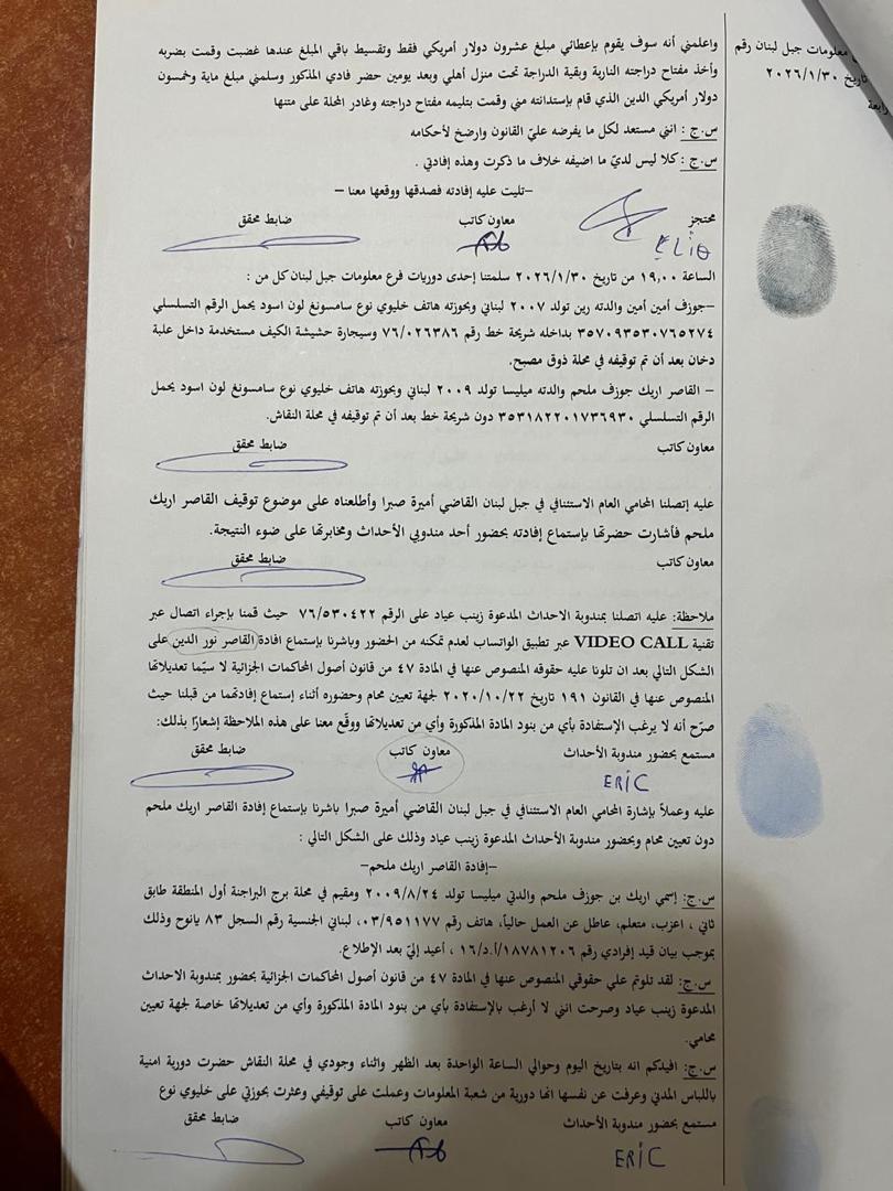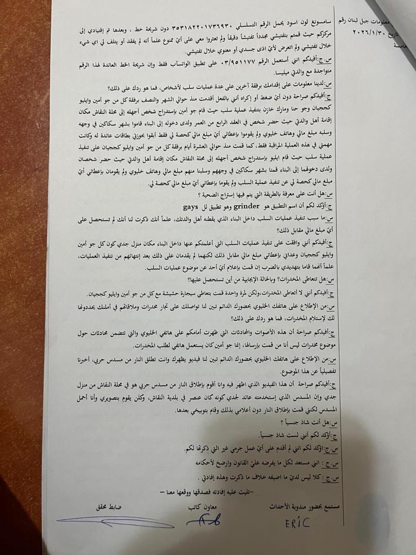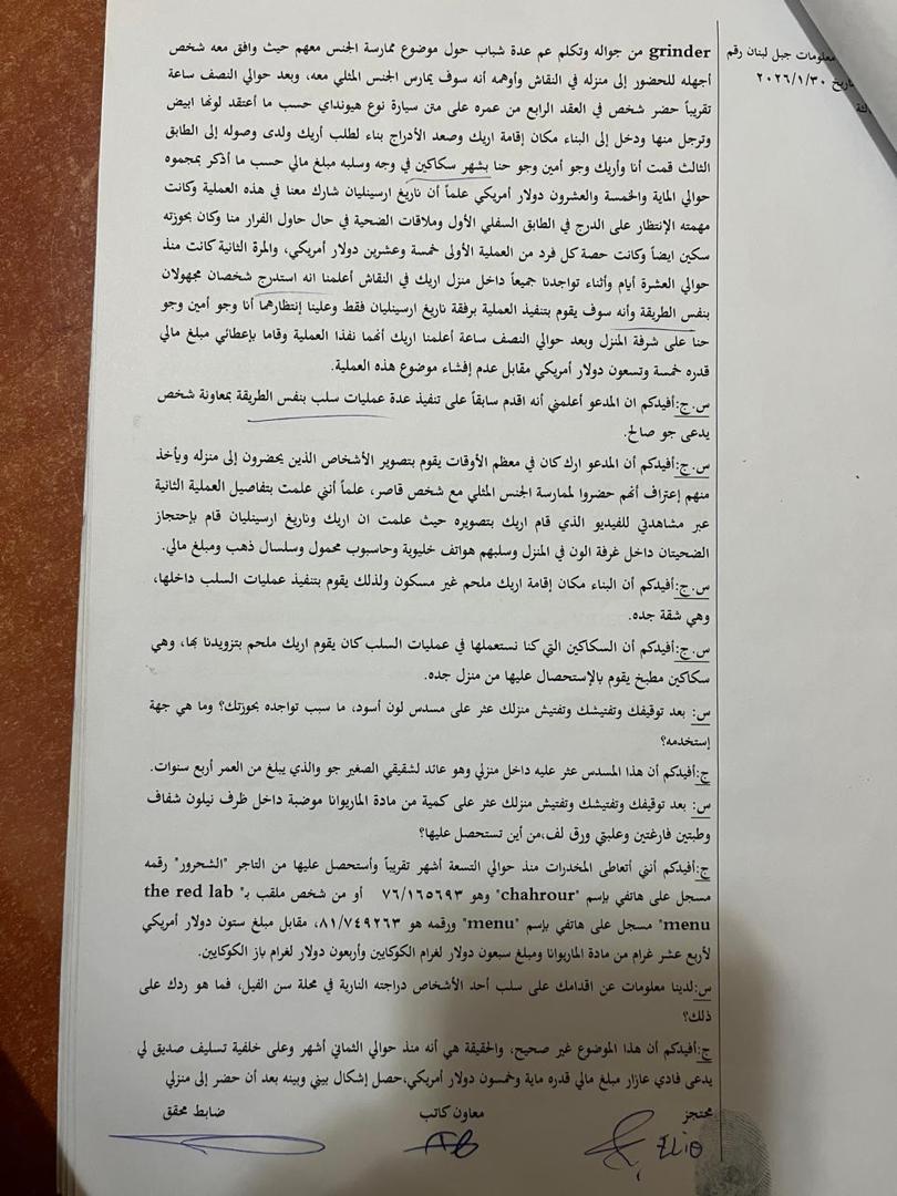 وخلال الاستماع إلى الإفادات أصولًا، وبعد تلاوة الحقوق القانونية، أدلى الموقوفون باعترافات صريحة، حيث أقرّ (ج.ا) بمشاركته مع آخرين في عدد من عمليات السلب، عبر استدراج الضحايا إلى محلة النقاش، مشيرًا إلى أنّ الأدوار كانت موزّعة بين من يتولى الاستدراج عبر الإنترنت، ومن يراقب محيط المكان، ومن يشارك مباشرة في تنفيذ السلب تحت تهديد السكاكين.