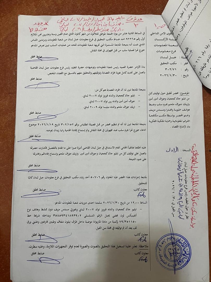 وتبيّن أنّ أفراد المجموعة هم: (ا.ك)، (ج.ا)، والقاصر (ا.م)، فيما ورد خلال التحقيق اسما (ن.ا) و(د.ح) كأشخاص شاركوا أو سهّلوا بعض عمليات السلب، ويجري العمل على تحديد دورهم الكامل.
